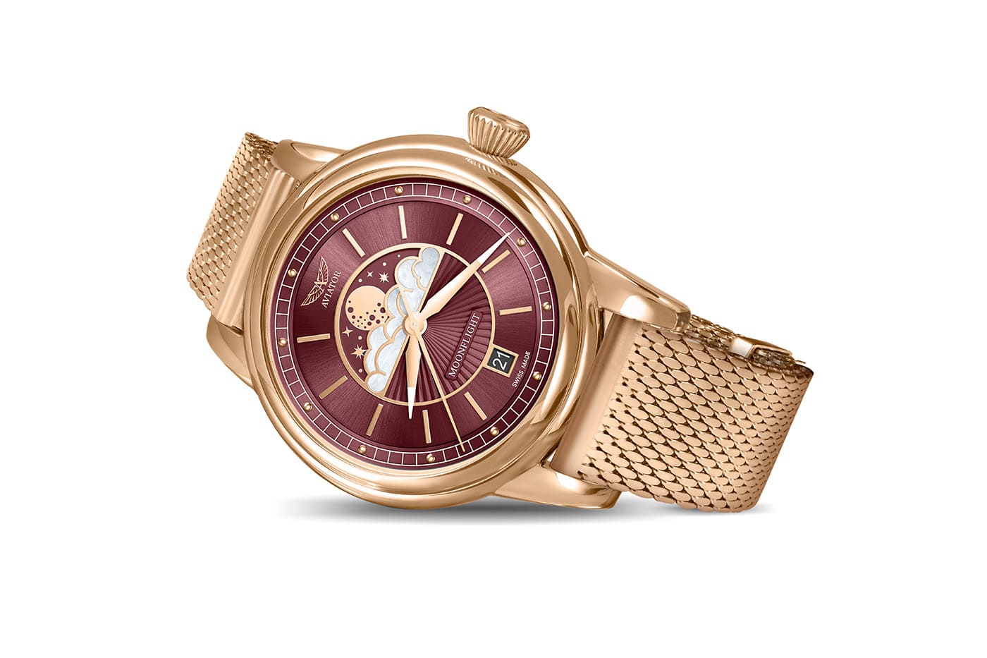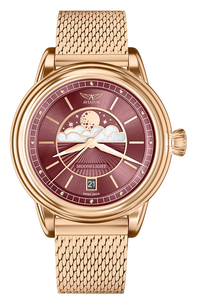 Extrémně tvrdé aproti poškrábání odolné safírové sklíčko s antireflexemchráníciferník s jemnými ocelovými indexy a ručičkami. Ty jsou vybaveny luminiscenčním materiálem, který vám pomůže odečíst aktuální čas ve tmě. Ciferník zdobí giloš v podobě slunečních paprsků a je vybaven subčíselníkem fáze měsíce. Jedinečný číselník fáze měsíce obsahuje mraky zasazené do jedinečného perleťového rámu, hvězdnou oblohu a zářící měsíc ve všech svých fázích. Funkce fáze měsíce je nejen krásnou ozdobou pro ženské oko, ale také užitečným mechanismem pro pozorování Měsíce bez pohledu z okna. Celý číselník je navržen s 3D vnímáním hloubky. Pod ním je vysoce přesný švýcarský Machineek na baterie. Kromě sledování času poskytuje informace o měsíčních fázích a datu, které si našlo své místo na 6. hodině.Tyto pozlacené dámské hodinky Aviator se síťovaným náramkem budou perfektním partnerem do kabelky, elegantní kostýmy a bižuterní doplňky.