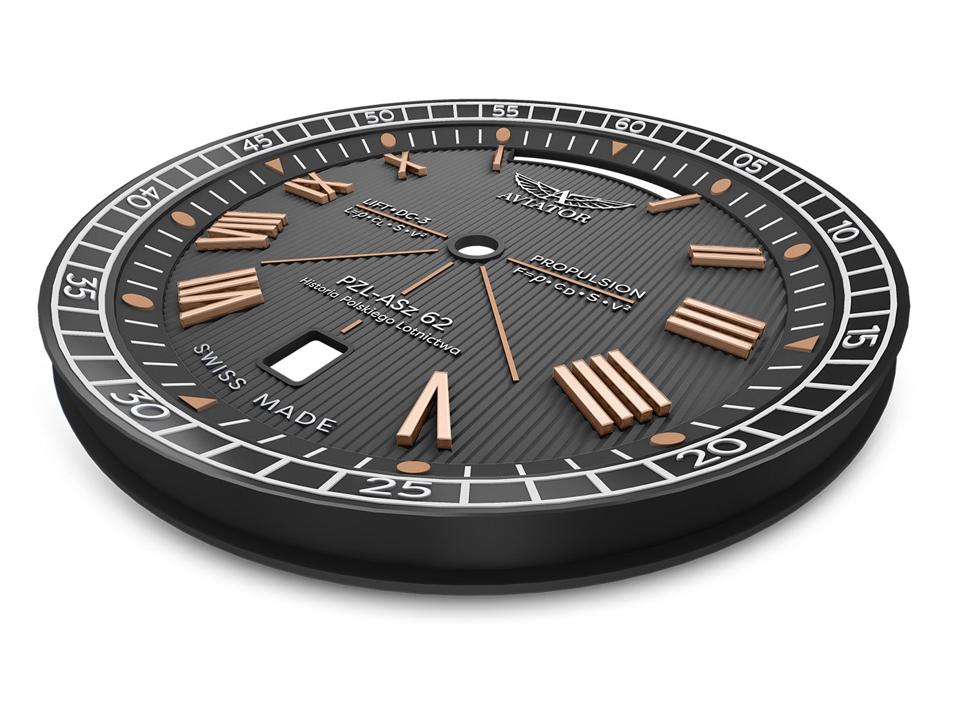 Letecké hodinky s datumem v polštině z polské speciální edice Aviator Douglas Polish Edition Day-Date 2021má víceúrovňový ciferník integrovaný se Machinekem (ráže AV-1000, základna - Sellita SW-240). Jeho design byl inspirován aerodynamikou, ergonomií a luxusem největšího letadla zlatého věku letectví - Douglas DC-3. Autentické navigační symboly zlepšují čitelnost. Jednoduché ručičky plněné materiálem Luminova X1 Top Grade poskytují zvýšení účinnosti až o 65 % - norma ISO 3157. Kovové arabské číslice s leštěným a zlatým povrchem ladí s pouzdrem. Antireflexní safírové sklo pro odolnost proti poškrábání a oslnění.