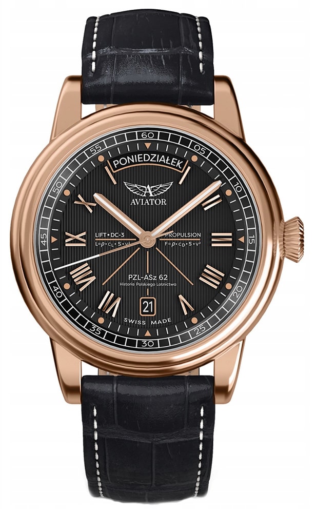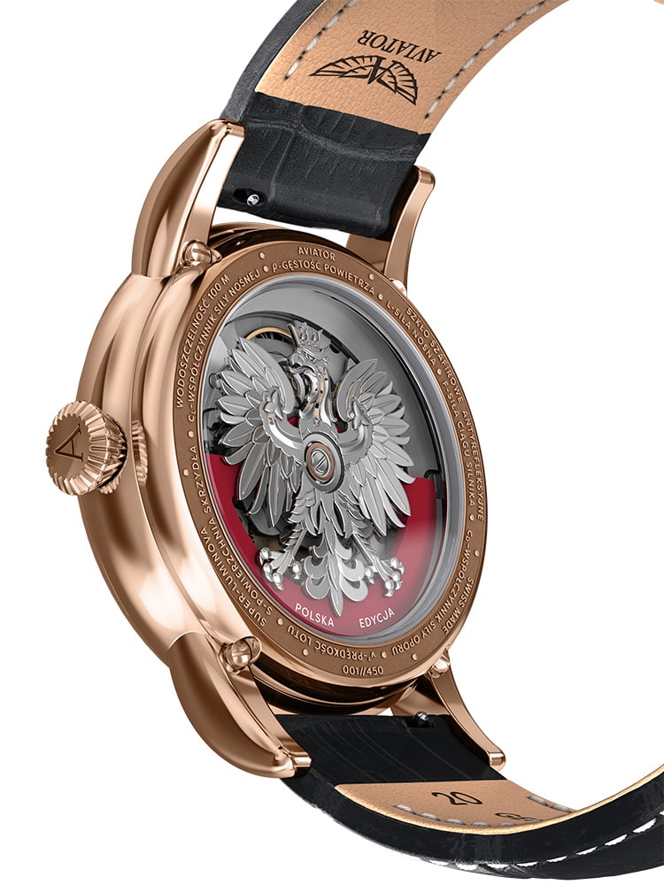 Limitované hodinky Polish Special Edition s datem a dnem v týdnu v Polish Aviator Douglas Polish Edition Day-Date 2021 V.3.35.2.282.4 PL. Současné pilotní hodinky s inovativním designem a funkcí pilotního příMachinee. Vznikly z vášně k hodinářství a zároveň z lásky k letectví. Připomenutí historie polského letectví zvýrazněním motoru PZL-ASz 62 a letecké výpočty na číselníku, stejně jako orel na 3D rotoru a červeně lakovaný balancér.