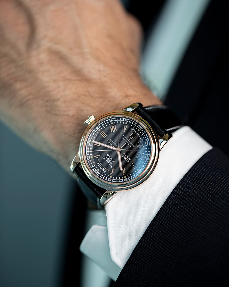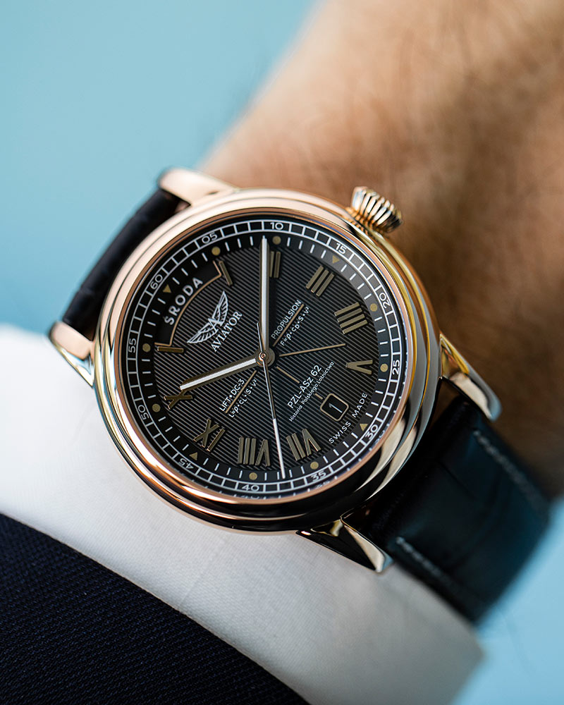 Průměr pouzdra pozlacených pánských hodinek Aviator je 41,20 mm. Jeho design se také vyznačuje odvážnou, efektivní geometrií, jako je trup Douglas DC-3. Je vyroben z nerezové oceli 316L, pokrytý odolným PVD povlakem z růžového zlata a vyleštěn do zrcadlového lesku. Jeho symetrické proporce doplnilo z vrchní i spodní strany safírové sklíčko. Vodotěsnost byla testována do 100 metrů / 10 ATM, díky čemuž jsou vhodné pro plavání a šnorchlování s těmito zlatými leteckými hodinkami. Prosklená a šroubovaná záda pouzdra poskytují úžasný pohled na přesný švýcarský Machineek, ve kterém systém Incabloc chrání před otřesy. Je na něm také vyryto individuální limitní číslo.