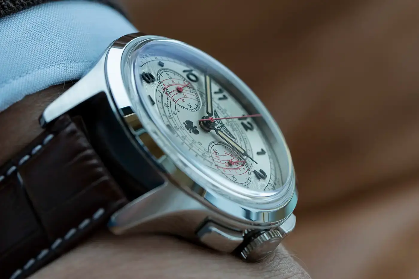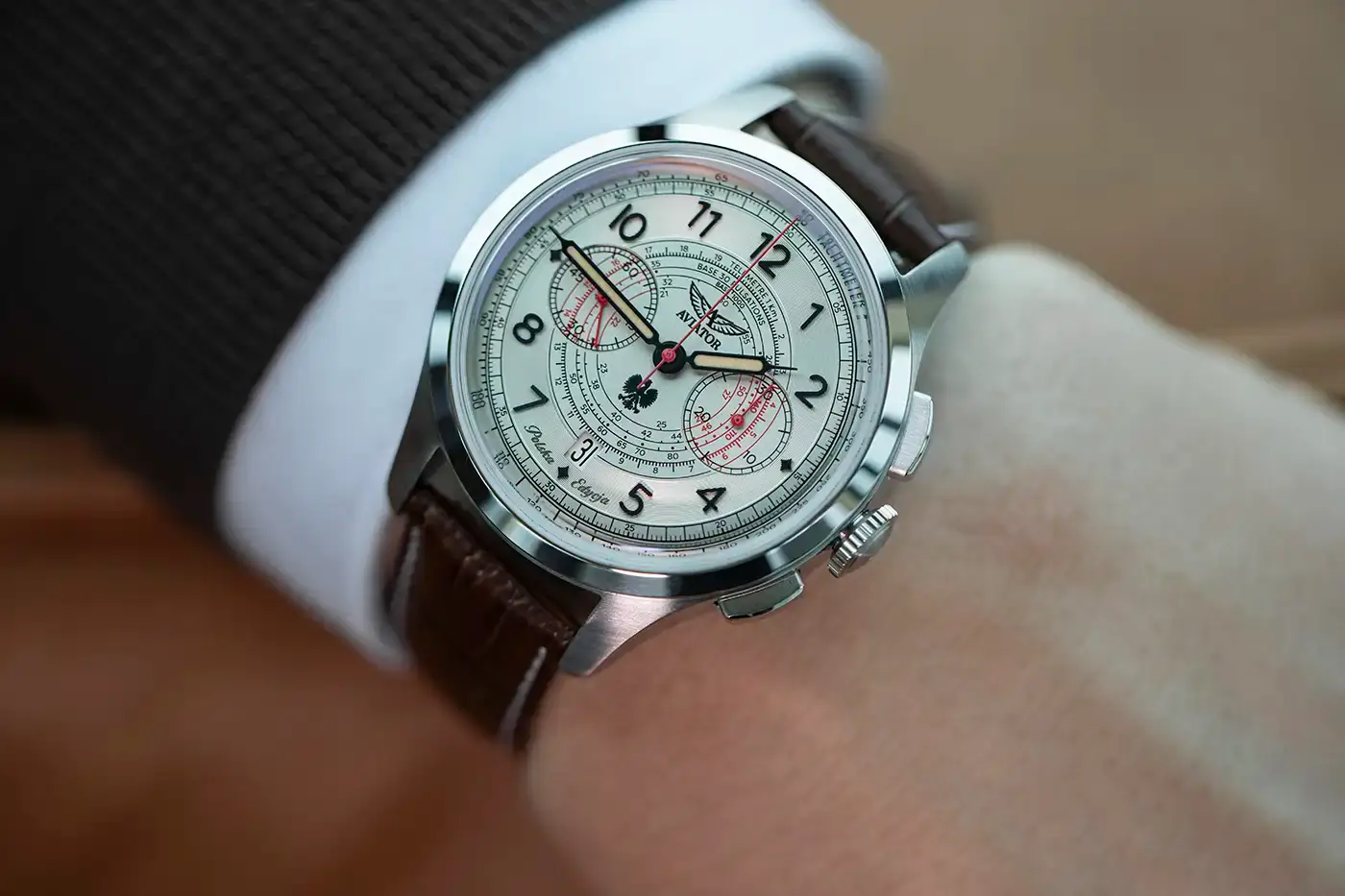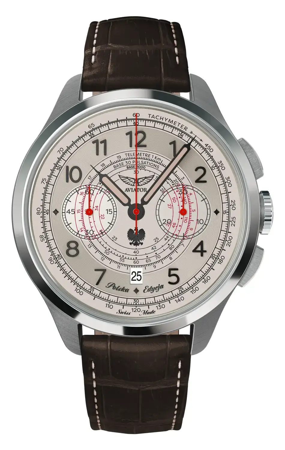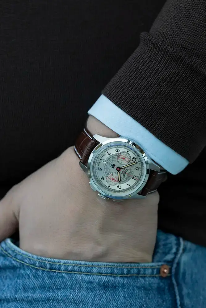 Aviator Heritage Chronograph Trimeter Polska Edycja V.4.40.0.351.4 PL to limitovaný pánský hodinky, které vynikajícím způsobem spojují eleganci s funkcionalitou, čerpající inspiraci z klasických leteckých hodinek. Na ciferníku jsou rozmístěny dva symetrické chronografy: na pozici 3 je 30minutový chronograf a na pozici 9 malý sekundový ukazatel. Hlavním prvkem je sekundová ručička v jasně červené barvě, která ladí s pulsometrem, umístěným ve středu ciferníku – přímý poklon k práci lékařů Letecké Záchranné Služby. Navíc hodinky s pulsometrem jsou vybaveny dalšími funkcemi, jako je tachymetrická stupnice pro měření rychlosti a telemetrická stupnice, která umožňuje měření vzdálenosti. Čitelnost údajů zajišťuje odolné proti poškrábání a vysoce prohnuté safírové sklo s antireflexní vrstvou, velké aplikované arabské číslice a široké ručičky vyplněné luminescenčním materiálem. Detaily, jako je nápis „Polska Edycja” a obraz orla bílého na ciferníku, podtrhují výjimečný charakter tohoto speciálního modelu, který zároveň vzdává hold polským pilotům a lékařům. Celý vzhled doplňuje ocelové pouzdro s jemně kartáčovaným povrchem, obohacené leštěným rámečkem.