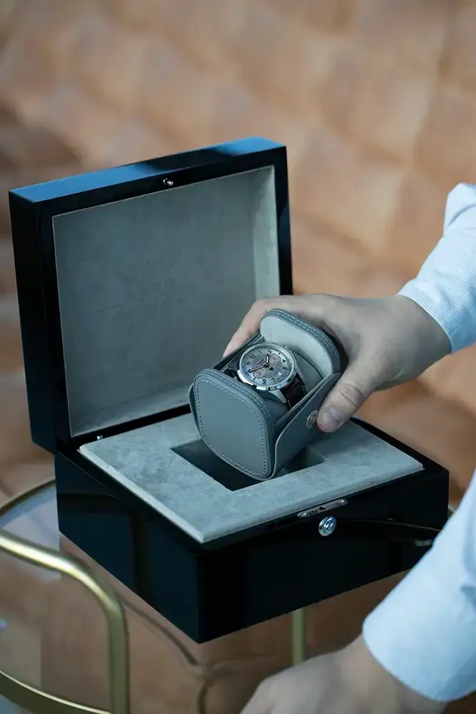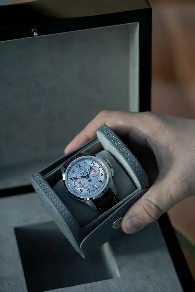 Exkluzivitu tohoto modelu podtrhuje také jeho luxusní balení. Hodinky s bicompax chronografem Aviator Trimeter jsou dodávány v elegantní dřevěné krabičce, jejíž povrch byl vyleštěn na vysoký lesk a pokryt několika vrstvami laku. Na víku je umístěno stříbrné logo značky Aviator, nápis „Polska Edycja” a symbol orla bílého. Vnitřek krabičky je vyložen jemnou alcantarou, a místo klasického polštáře obsahuje praktické cestovní pouzdro, které zvyšuje funkčnost celého balení. Aviator Heritage Chronograph Trimeter je sběratelský hodinky, který se na jedné straně vyznačuje nadčasovým stylem a nezaměnitelnou kvalitou, a na druhé straně představuje symbolické uznání polské tradice a úspěchů.