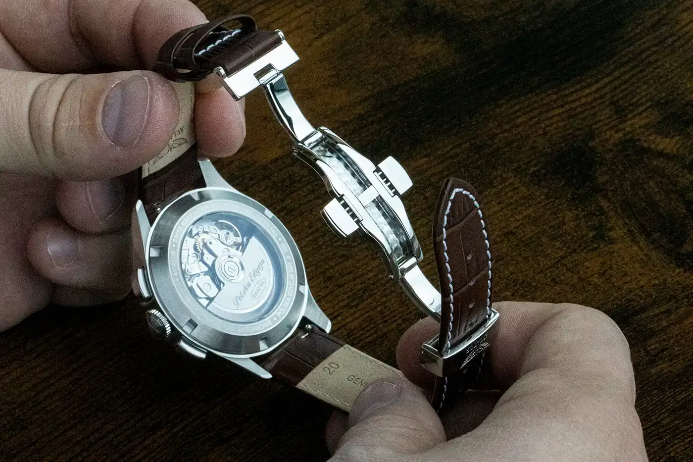 Elegantní letecké hodinky Aviator Polska Edycja se vyznačují také pokročilým mechanismem. Pohánějí je švýcarský kalibr Sellita SW510 BH s automatickým nátahem, který nabízí spolehlivou přesnost díky frekvenci 28 800 kmitů za hodinu a impozantní rezervě chodu až 62 hodin. Mechanismus je ozdoben kyvadlem s gravírováním „Polska Edycja” a číslem limitované edice, která čítá pouze 250 kusů. Výjimečnost tohoto automatického chronografu pro piloty Heritage Chronograph Trimeter Swiss Made podtrhuje také personalizovaný zadní kryt, na němž jsou umístěny polské nápisy – tyto detaily přitahují pozornost a dodávají hodinkám hlubší význam. Hodinky jsou vybaveny elegantním hnědým krokodýlí kůží na pásku, zakončeným pohodlnou a bezpečnou sponou se dvěma tlačítky.