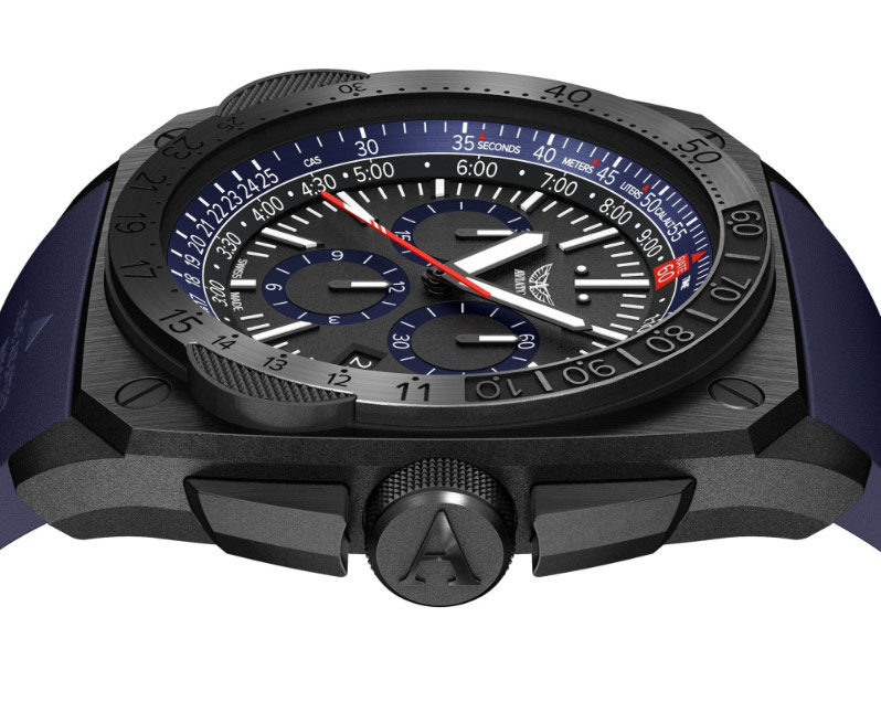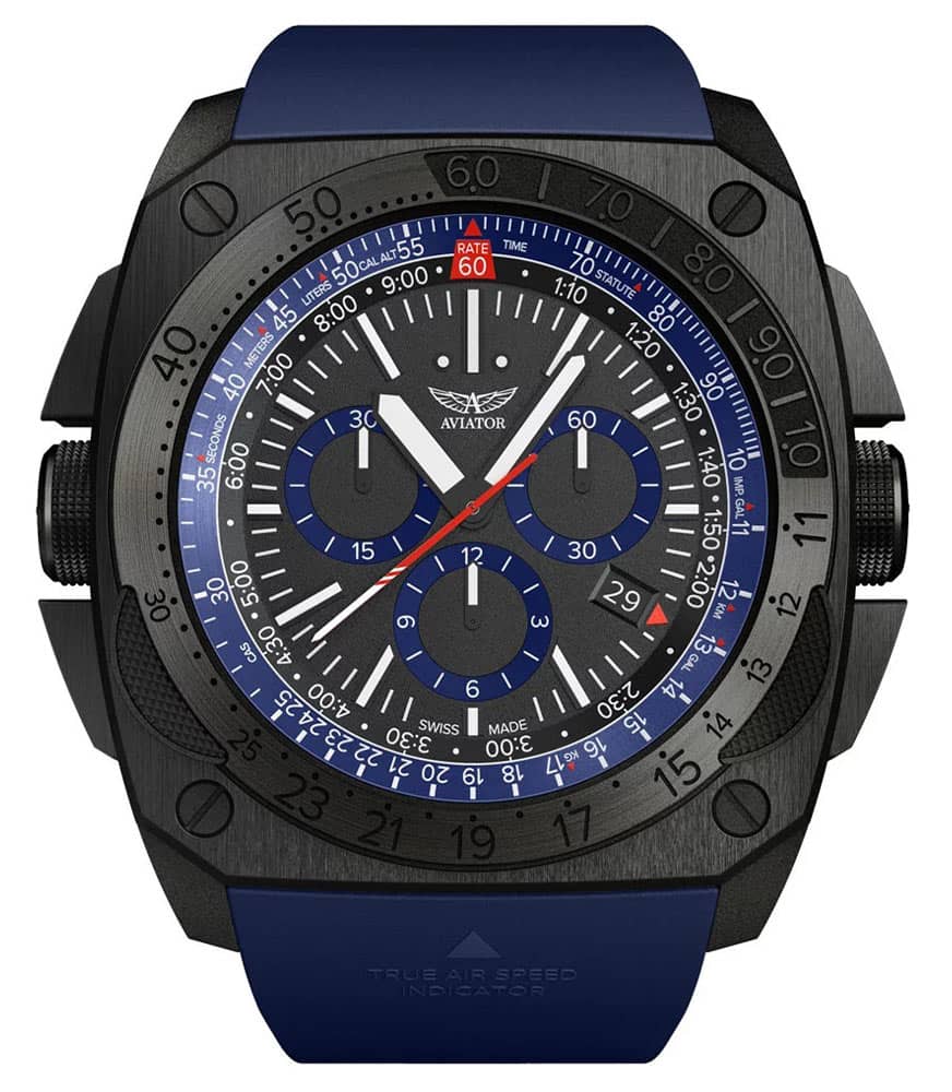 Safírové sklo vysoce odolné proti poškrábání s antireflexní ochranou chrání multifunkční černý ciferník s modrými akcenty . Ručičky a indexy jsou opatřeny svítícím povlakem Super-LumiNova , který vám pomůže odečítat aktuální čas v naprosté tmě. Ve čtyři hodiny je datumové okénko, které označuje den v měsíci. Výrobce vybavil hodinky funkcí chronografu, jinak také stopky. Speciální subciferníky na ciferníku vám pomohou změřit přesný čas například při závodě. Multifunkční posuvné pravítko E6B, které je založeno na leteckém počítači. Pomůže vám vypočítat úhly, dobu hoření paliva, předpokládanou dobu letu nebo cestování – pro výpočty a obsluhu vnitřní stupnice slouží korunka umístěná na levé straně hodinek a jednosměrná luneta aplikovaná na přední část pouzdra. Celý projekt je inspirován příMachinei z kokpitu letounu MIG-29. Prezentovaný model je velmi zajímavým doplňkem pánského šatníku. Hodinky se perfektně hodí k různým typům outfitů.