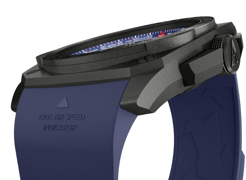 Geometrické pouzdro ve skutečně pánské velikosti 47 mm je vyrobeno z nerezové oceli 316L v černé barvě s PVD povlakem . Na zadní straně jsou šroubovaná záda pouzdra zdobená symbolem v podobě rytiny letounu MIG 29 z produkce firmy Mikoyan. Hodinky byly utěsněny na 100 metrů, což vám umožňuje plavat bez obav z poškození mechanismu . Hodinky jsou kombinovány s pohodlným modrým gumovým páskem s klasickým zapínáním na přezku. Gumové řemínky se snadno udržují v čistotě a díky vysoké flexibilitě se snadno nasazují na zápěstí.