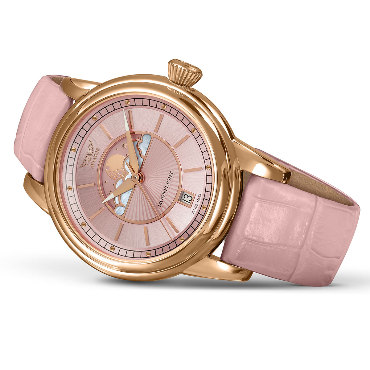 Extrémně tvrdé a proti poškrábání odolné safírové sklo s antireflexem chrání růžový ciferník s jemnými ocelovými indexy a ostrými ručičkami. Ručičky jsou vybaveny svítící lumou, která vám pomůže odečíst aktuální čas v naprosté tmě. Ciferník je zdoben gilošovaným vzorem v podobě slunečních paprsků a opatřen sytě barevným subčíselníkem funkce měsíční fáze. Jedinečný číselník fáze měsíce představuje mraky zasazené do jedinečné perleti v pozlaceném rámu, hvězdnou oblohu a zářící měsíc ve všech fázích. Funkce fáze měsíce je nejen krásnou ozdobou pro ženské oko, ale také užitečným mechanismem pro pozorování Měsíce bez pohledu z okna. Celý ciferník je navržen ve stylu Art Deco s trojrozměrným vnímáním hloubky. Módní barvy hodinek jistě budou slušet něžnému pohlaví. Hodinky budou perfektním partnerem pro kabelky, elegantní kostýmy a bižuterní doplňky.