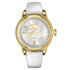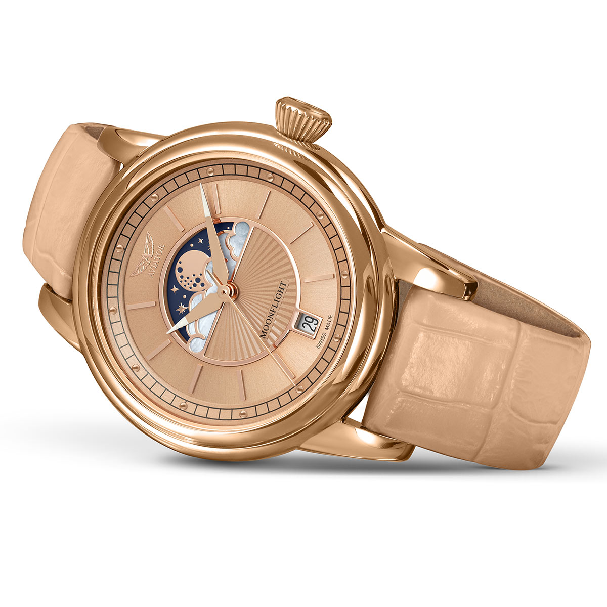 Mimořádně tvrdé a proti poškrábání odolné safírové sklo s antireflexem chrání krémový ciferník s jemnými ocelovými indexy a ostrými ručičkami. Ručičky jsou vybaveny svítící lumou, která vám pomůže odečíst aktuální čas v naprosté tmě. Ciferník je zdoben gilošovaným vzorem v podobě slunečních paprsků a opatřen sytě barevným subčíselníkem funkce měsíční fáze. Jedinečný číselník fáze měsíce představuje mraky zasazené do jedinečné perleti v pozlaceném rámu, hvězdnou oblohu a zářící měsíc ve všech fázích. Funkce fáze měsíce je nejen krásnou ozdobou pro ženské oko, ale také užitečným mechanismem pro pozorování Měsíce bez pohledu z okna. Celý ciferník je navržen ve stylu Art Deco s trojrozměrným vnímáním hloubky. Módní barvy hodinek jistě budou slušet něžnému pohlaví. Hodinky budou perfektním partnerem pro kabelky, elegantní kostýmy a bižuterní doplňky.