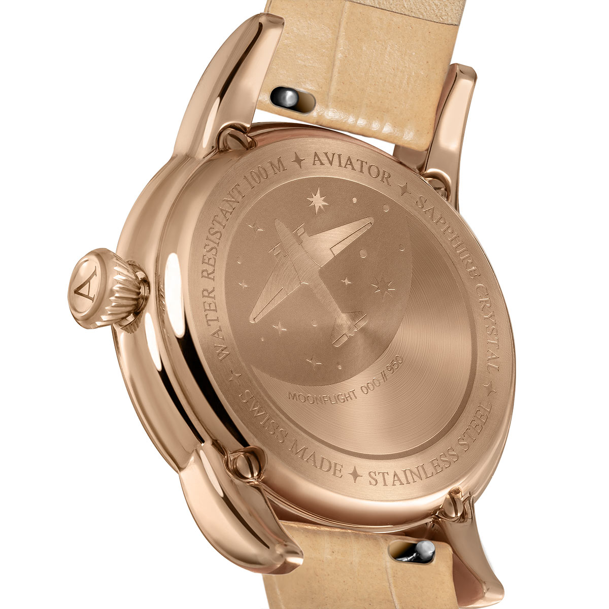 Ve 30. letech 20. století poskytoval každý let legendárního letadla Douglas DC-3 atmosféru elegance a luxusu, která se v dnešních vysokorychlostních komerčních letech nenachází. V každém aspektu dal Douglas DC-3 světu lepší pohled na cestování a definoval tak Zlatý věk letectví – dámské hodinky Aviator V.1.33.2.260.4 z kolekce Moonflight jsou odkazem na tyto časy a zážitky.