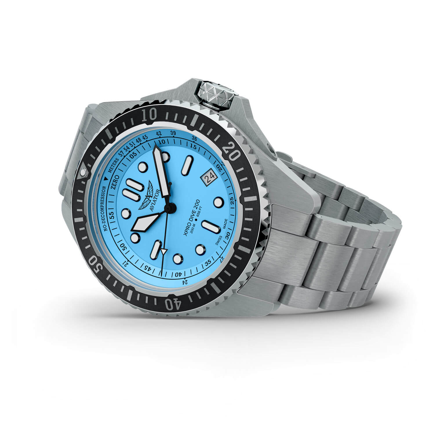 Modrý ciferník s vysokým kontrastem byl navržen pro maximální čitelnost v extrémních podmínkách. Velké indexy a ručky jsou pokryty vrstvou Super-LumiNova® X1 a BGW9, která po krátkém nasvícení svítí více než 12 hodin, což zaručuje dokonalou viditelnost v hlubinách i po setmění. Datumovka na čtvrté hodině přidává na praktičnosti a pod ciferníkem pracuje spolehlivý švýcarský strojek Ronda 6003.D, zajišťující přesnost v jakýchkoli podmínkách. Potápěčské hodinky Aviator V.1.42.0.376.5 na náramku jsou nástrojem pro ty, kteří hledají partnera pro úkoly, ne doplněk.