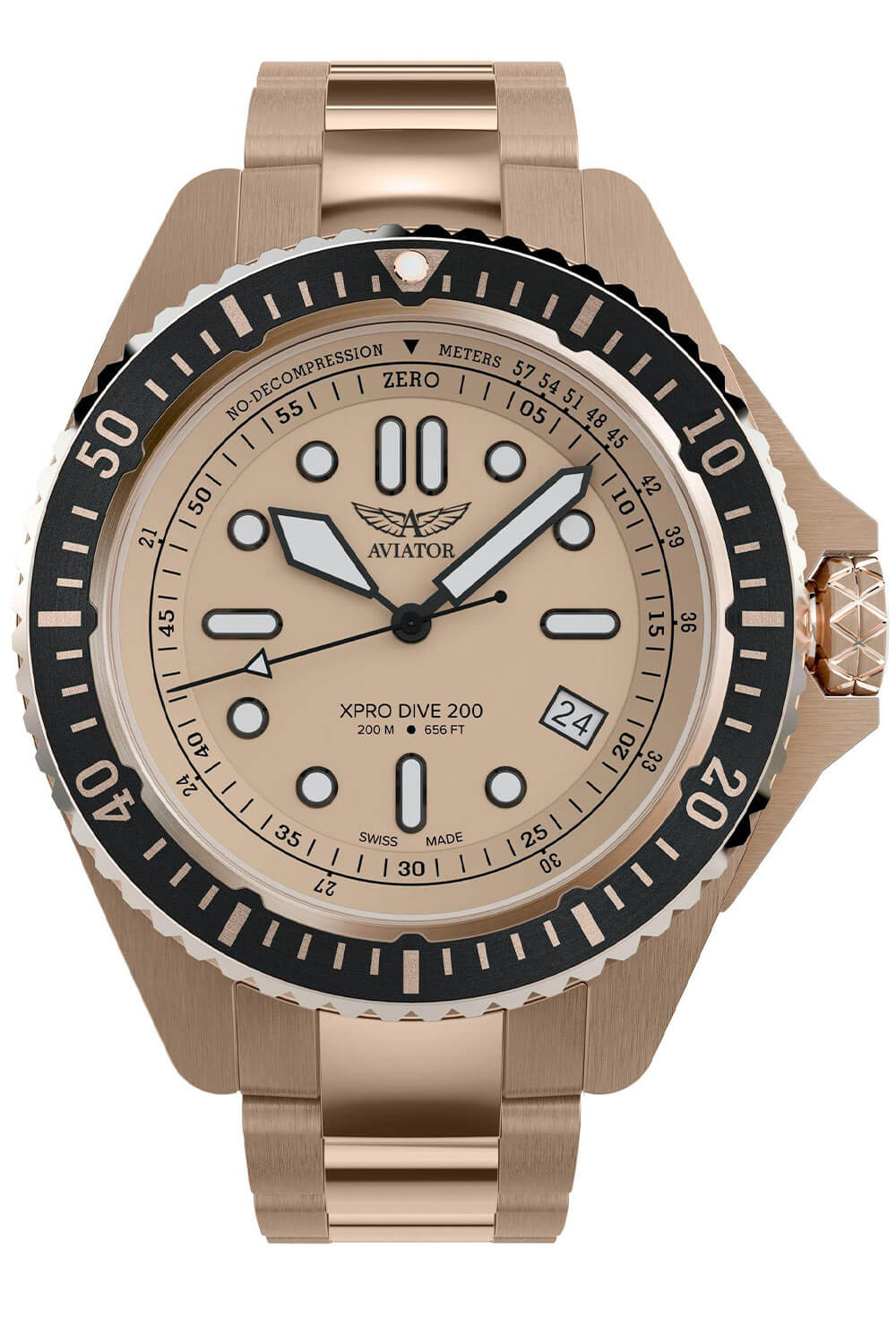 Béžový ciferník s vysokým kontrastem byl navržen pro maximální čitelnost v extrémních podmínkách. Velké indexy a ručky jsou pokryty vrstvou Super-LumiNova® X1 a BGW9, která po krátkém nasvícení svítí více než 12 hodin, což zaručuje dokonalou viditelnost v hlubinách i po setmění. Datumovka na čtvrté hodině přidává na praktičnosti a pod ciferníkem pracuje spolehlivý švýcarský strojek Ronda 6003.D, zajišťující přesnost v jakýchkoli podmínkách. Potápěčské hodinky Aviator V.1.42.2.374.5 na náramku bicolor jsou nástrojem pro ty, kteří hledají partnera pro úkoly, ne doplněk.
