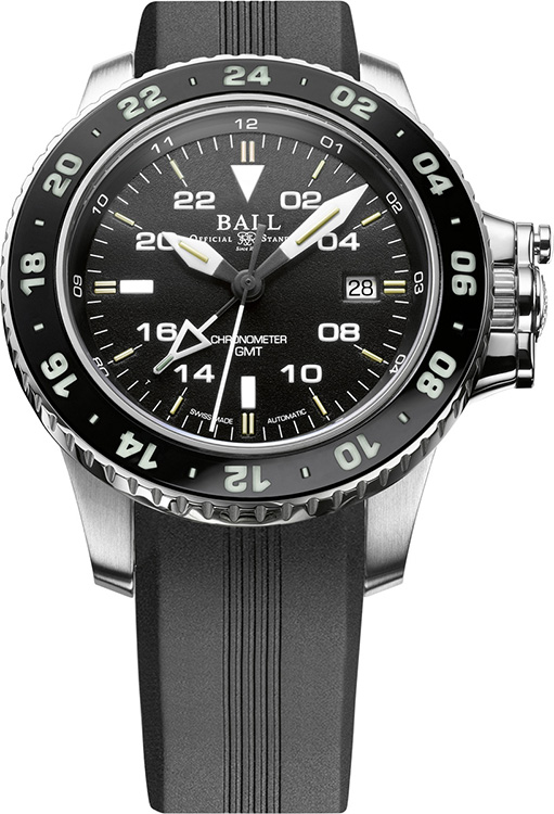 Hodinky Engineer Hydrocarbon AeroGMT II se vyznačují sportovním pouzdrem, které je osazeno unikátní ochranou korunky. Tradičně má časomíra 43 plynových tyčí na ručičkách, číselníku a otočné lunetě. Safírové sklíčko odolné proti poškrábání najdeme nejen na pouzdře, ale také na obousměrné otočné lunetě s 24hodinovým časem. Ball AeroGMT II poskytuje čitelnost, prémiový materiál a mužný vzhled. Přes den se hodinky prezentují v klasických barvách, černé a bílé, ale ve tmě zaujmou zářivě modrou, žlutou a oranžovou barvou mikroplynových trubic a SuperLuminova.