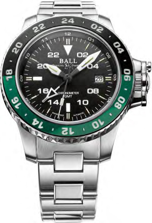 Nejnovější edice sportovních hodinek Ball Engineer Hydrocarbon AeroGMT II DG2018C-S11C-BK . Masivní 42mm pouzdro s unikátním krytem korunky zdobí černý a zelený prsten. 24hodinová otočná luneta je chráněna safírovým sklem odolným proti poškrábání. Tradičně má časomíra 44 plynových tyčí na ručičkách, číselníku a otočné lunetě. Ball AeroGMT II poskytuje čitelnost, prémiový materiál a mužný vzhled. Přes den se hodinky prezentují v klasických barvách, černé a bílé, ale ve tmě zaujmou zářivě modrou, zelenou, žlutou a oranžovou barvou mikro plynových trubic a SuperLuminova.