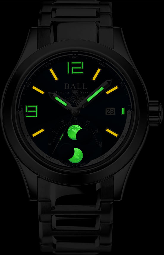 Zepředu jsou pánské hodinky Ball chráněny kvalitním safírovým sklem s antireflexní úpravou. Safírové sklo chrání minimalistický ciferník v modre barvě. Když den ustupuje noci, časové ručičky svítí jasně díky technologii mikroplynové s trubice, dodávajíce kouzlo a eleganci. Jejich luminiscence usnadňuje čtení času i v nejtemnějších chvílích, překračujíc standardy hodinářského průmyslu. Chronograf Ball s fázemi Měsíce také nabízí zobrazení data. Okno s datováním je umístěno ve 3 hodiny.