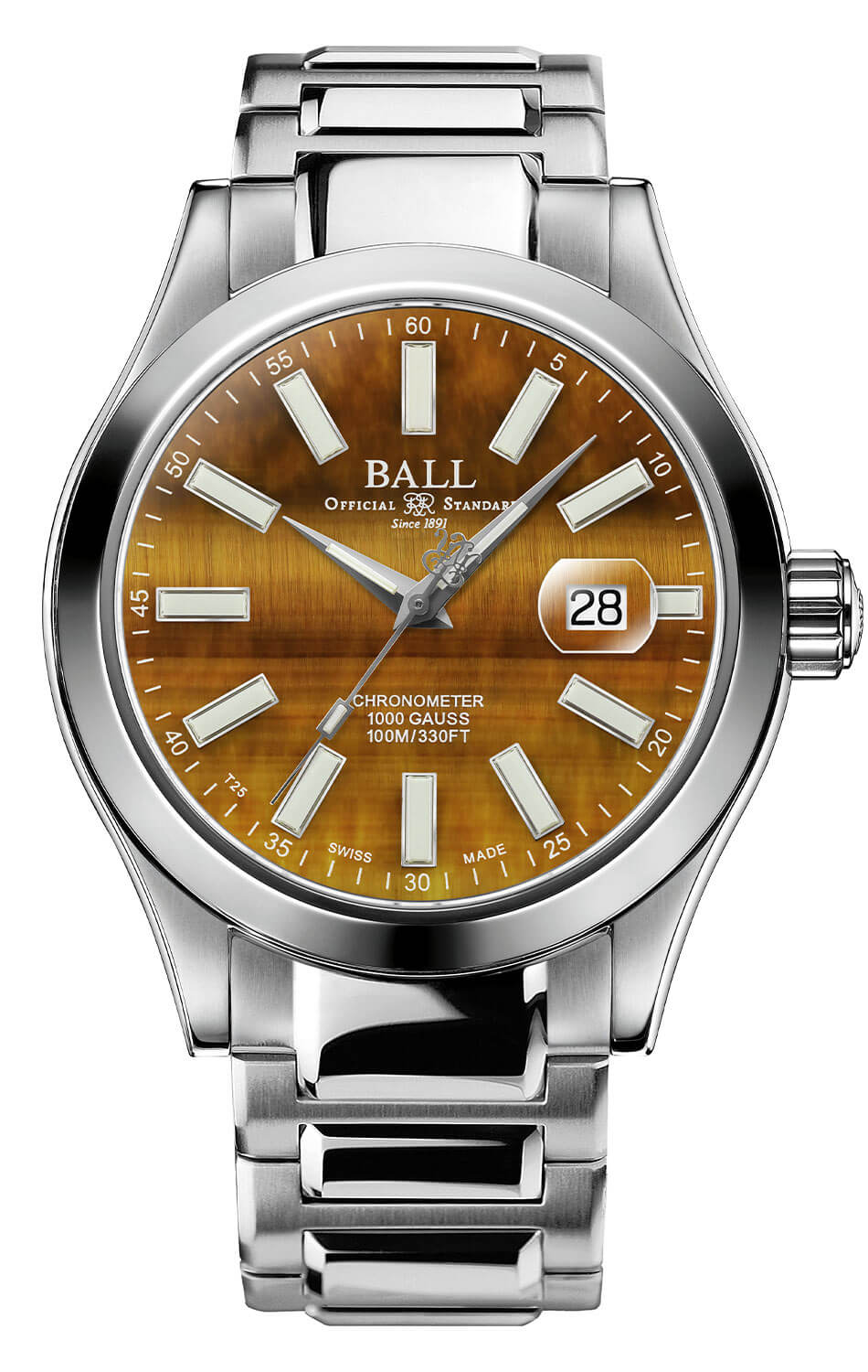 Číselník z tygřího oka je esencí vytříbeného stylu. Jeho zlatohnědé odlesky se třpytí ve světle a dodávají celému modelu jedinečný charakter – není to jen impozantní vizuální prvek, ale také symbol síly, odvahy a nezávislosti. Ručičky a indexy jsou vybaveny tritiovými mikrokapslemi, které svítí ve tmě bez nutnosti externího zdroje světla. V srdci hodinek pracuje švýcarský automatický strojek, jehož přesnost potvrzuje certifikát COSC. Navíc je mechanismus chráněn systémem Amortiser®, který zajišťuje odolnost proti nárazům až do 5000Gs, což činí tento model spolehlivým i v těch nejnáročnějších podmínkách.