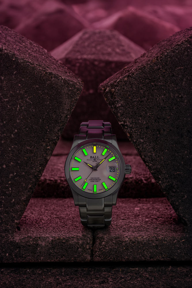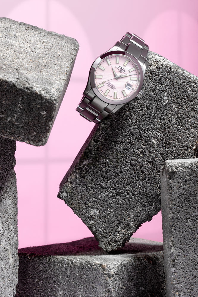 Logo BALL na růžovém štítu je symbolem preciznosti, v souladu s oficiálními železničními normami platnými od samého počátku existence značky. Dvě písmena „RR“ odkazující na chronometr jsou poctou železničnímu dědictví, které je nedílnou součástí historie švýcarského výrobce hodin. Ciferník hodinek byl záměrně zjednodušen se zaměřením na světelné indexy. Díky mikrotrubičkám s plynem tritium jsou indexy a ručičky perfektně viditelné i v noci a zajišťují bezkonkurenční odečítání času. Inovativní technologie Swiss BALL založená na zapouzdření plynu H3 ve skle mikrotrubičky zaručuje, že hodinky jsou vždy jasné, bez nutnosti externího dobíjení.