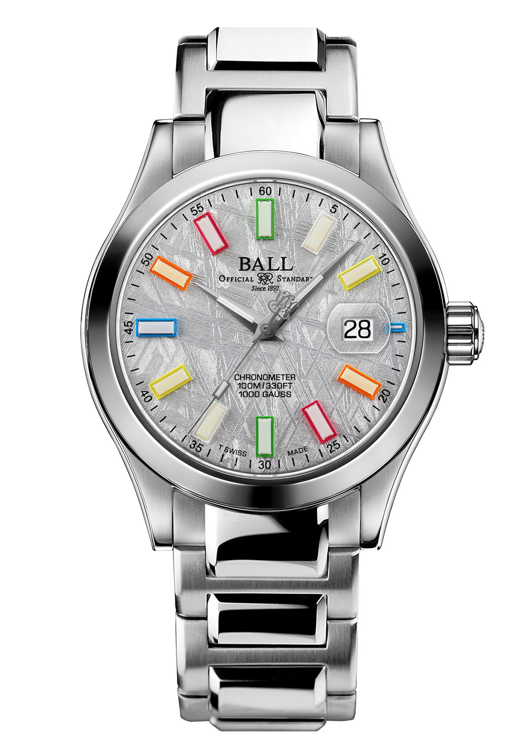 Nejvýraznějším prvkem těchto hodinek je ciferník vyrobený z autentického meteoritu. Šedý jedinečný vzor mu dodává kosmický charakter a činí každý kus jedinečným. Indexy a ručky jsou vyplněny tritiem, díky čemuž je číselník extrémně čitelný za všech světelných podmínek. Plynové mikrotrubičky vyzařují intenzivní, dlouhotrvající světlo v barvách duhy bez ohledu na to, jak tmavé je okolí. Toto řešení, typické pro hodinky Ball, zaručuje vynikající viditelnost i uprostřed noci. Uvnitř pouzdra je přesný automatický mechanismus s certifikací COSC, který potvrzuje jeho spolehlivost a preciznost. Tento švýcarský certifikát je zárukou, že hodinky splňují nejvyšší standardy přesnosti chodu. Automatické hodinky Ball NM9026C-S46C-MSLR jsou skutečným mistrovským dílem hodinářského inženýrství, které uspokojí i ty nejnáročnější uživatele.