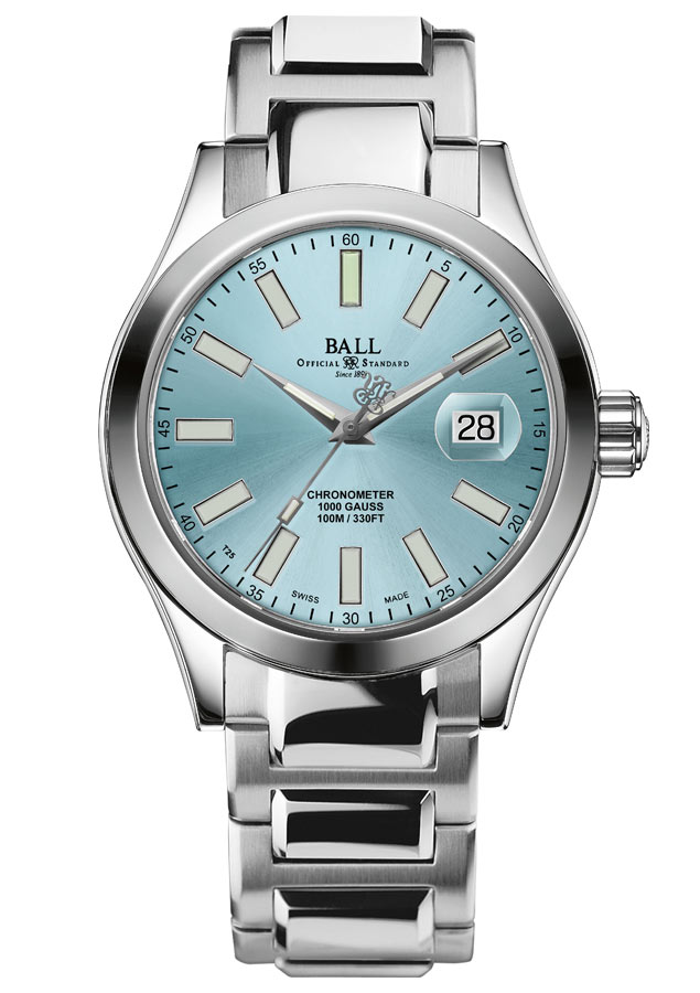 Klasické hodinky Ball Engineer III Marvelight Chronometer NM9026C-S6CJ-IBE s ledově modrým ciferníkem. Pánskou estetiku potěší dokonale vyvážený design, detaily odkazující na dědictví značky a elegance, které nechybí sportovní dynamika a solidnost. Logo BALL na číselníku, symbol preciznosti podle oficiálních železničních norem již od roku 1891, spolu s prestižní značkou „Swiss Made“ a zmínkou o chronometru, působí jako opravdová záruka přesnosti. Dvě písmena „R“ z ochranné známky „RailRoad“ na konci sekundové ručičky jsou odkazem na železniční dědictví švýcarské značky. Kromě těchto velmi důležitých detailů byl ciferník co nejvíce zjednodušen, aby byla veškerá pozornost zaměřena na svítící ukazatele hodin. Ty díky umístění mikrozkumavek s plynem tritiem umožňují bezkonkurenční čtení v noci. Trubky zaručují perfektní jas, který je asi 100krát účinnější než běžná luminiscenční barva používaná v hodinářském průmyslu. Tato nejmodernější švýcarská technologie používaná společností BALL je založena na zapouzdření plynu H3 ve skle mikrozkumavky. Světelná energie se uvolní, když částice H3 narazí na vnitřní barevný indexový povrch, aniž by bylo nutné externí dobíjení. Engineer III Marvelight Chronometer obsahuje celkem 14 mikrozkumavek, žluté ve 12 hodin a zelené po zbytek hodin a indikací.