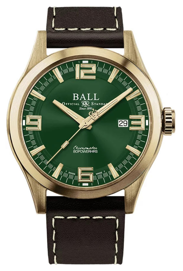 Jeho pouzdro z bronzové slitiny nejen dodává eleganci, ale také poskytuje výjimečnou odolnost proti nárazu a korozi. Obálka má navíc zlatý povlak. Jsou to hodinky, které jsou perfektní do extrémních podmínek, získávají osobitý vzhled, který se v průběhu času mění a vyprávějí jedinečný příběh pro každého uživatele. Pánské hodinky Ball 43 mm jsou spárovány s hnědým koženým řemínkem ve vintage stylu. Je vybavena systémem rychlé výměny bez nutnosti použití nářadí. Díky možnosti ponoření do hloubky 100 metrů jsou hodinky nejen elegantní, ale také funkční, ideální pro vodní sporty.