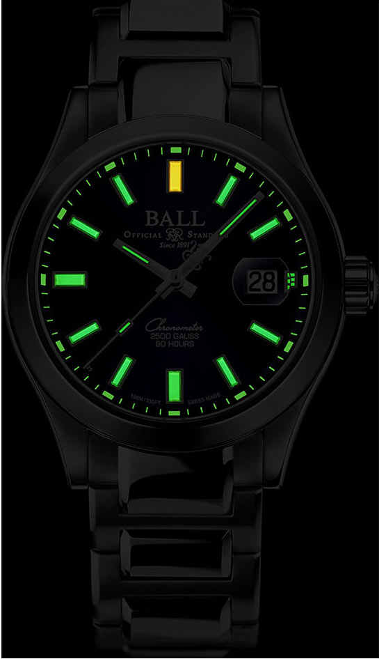 Safírové sklíčko s antireflexní vrstvou nejen chrání před poškrábáním, ale také zajišťuje výbornou viditelnost modrého ciferníku. 17 mikroplynových trubic s přehlednými indexy a ručičkami zaručuje vynikající čitelnost i za špatných světelných podmínek. Ve tři hodiny je datumové okénko s lupou usnadňující čtení aktuálního dne v měsíci. Náramkové hodinky Ball jsou poháněny strojkem Manufacture Caliber RRM7309-CS, který nabízí rozsah přesnosti -2 až +4 sekundy za den. To je vyjádřením závazku značky BALL Watch obnovit standardy přesnosti železnic. Silikonová pružina v mechanismu zaručuje bezkonkurenční přesnost i v nejnáročnějších podmínkách, chrání před vlivem magnetického pole a vysoké teploty.