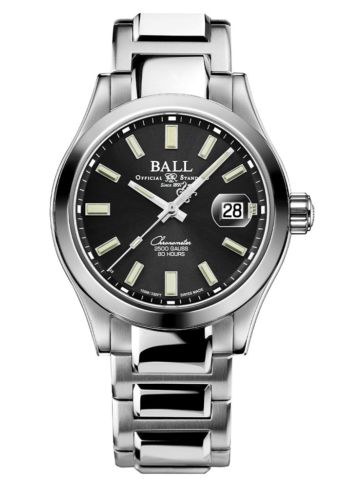 Safírové sklíčko s antireflexní vrstvou nejen chrání před poškrábáním, ale také zajišťuje skvělou viditelnost černého ciferníku. 17 mikroplynových trubic s přehlednými indexy a ručičkami zaručuje vynikající čitelnost i za špatných světelných podmínek. Ve tři hodiny je datumové okénko s lupou usnadňující čtení aktuálního dne v měsíci. Náramkové hodinky Ball jsou poháněny strojkem Manufacture Caliber RRM7309-CS, který nabízí rozsah přesnosti -2 až +4 sekundy za den. To je vyjádřením závazku značky BALL Watch obnovit standardy přesnosti železnic. Silikonová pružina v mechanismu zaručuje bezkonkurenční přesnost i v nejnáročnějších podmínkách, chrání před vlivem magnetického pole a vysoké teploty.