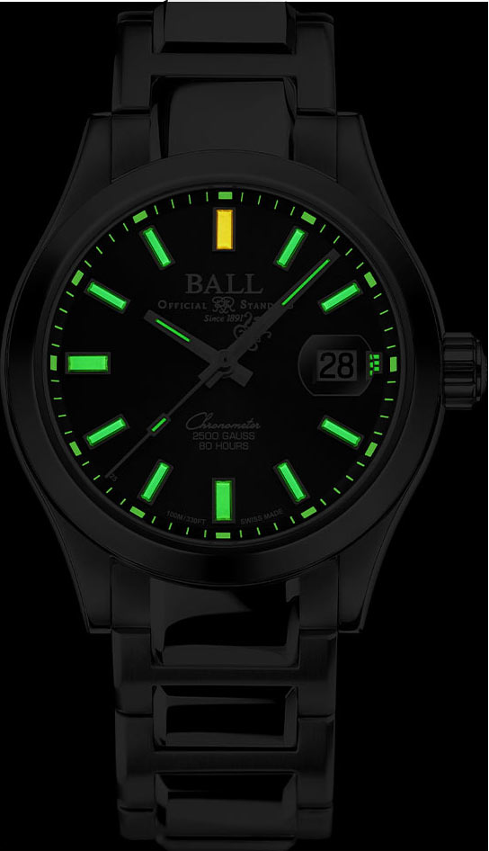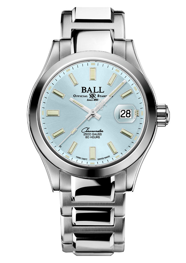 Safírové sklíčko s antireflexní vrstvou nejen chrání před poškrábáním, ale také zajišťuje skvělou viditelnost světle modrého ciferníku Tiffany Blue. 17 mikroplynových trubic s přehlednými indexy a ručičkami zaručuje vynikající čitelnost i za špatných světelných podmínek. Ve tři hodiny je datumové okénko s lupou usnadňující čtení aktuálního dne v měsíci. Náramkové hodinky Ball jsou poháněny strojkem Manufacture Caliber RRM7309-CS, který nabízí rozsah přesnosti -2 až +4 sekundy za den. To je vyjádřením závazku značky BALL Watch obnovit standardy přesnosti železnic. Silikonová pružina v mechanismu zaručuje bezkonkurenční přesnost i v nejnáročnějších podmínkách, chrání před vlivem magnetického pole a vysoké teploty.