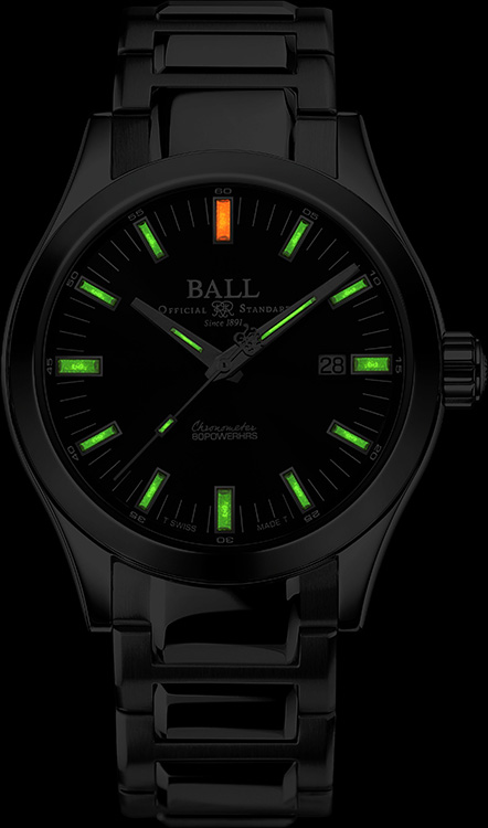 Ball Engineer M Marvelight je vylepšen o náramek z nerezové oceli se skládací přezkou. Kontrast mezi broušeným povrchem vnějších článků a leštěnými prvky dodává elegantní, elegantní a sportovní charakter.