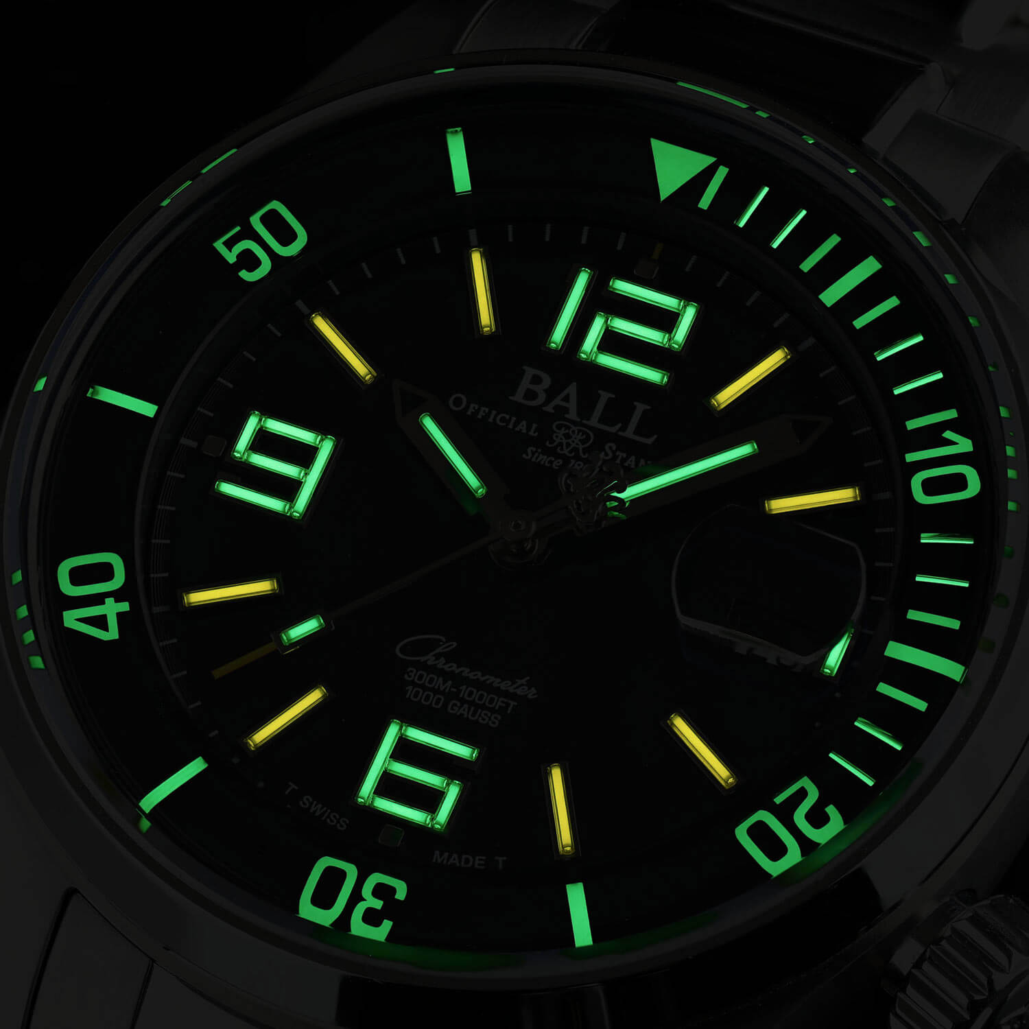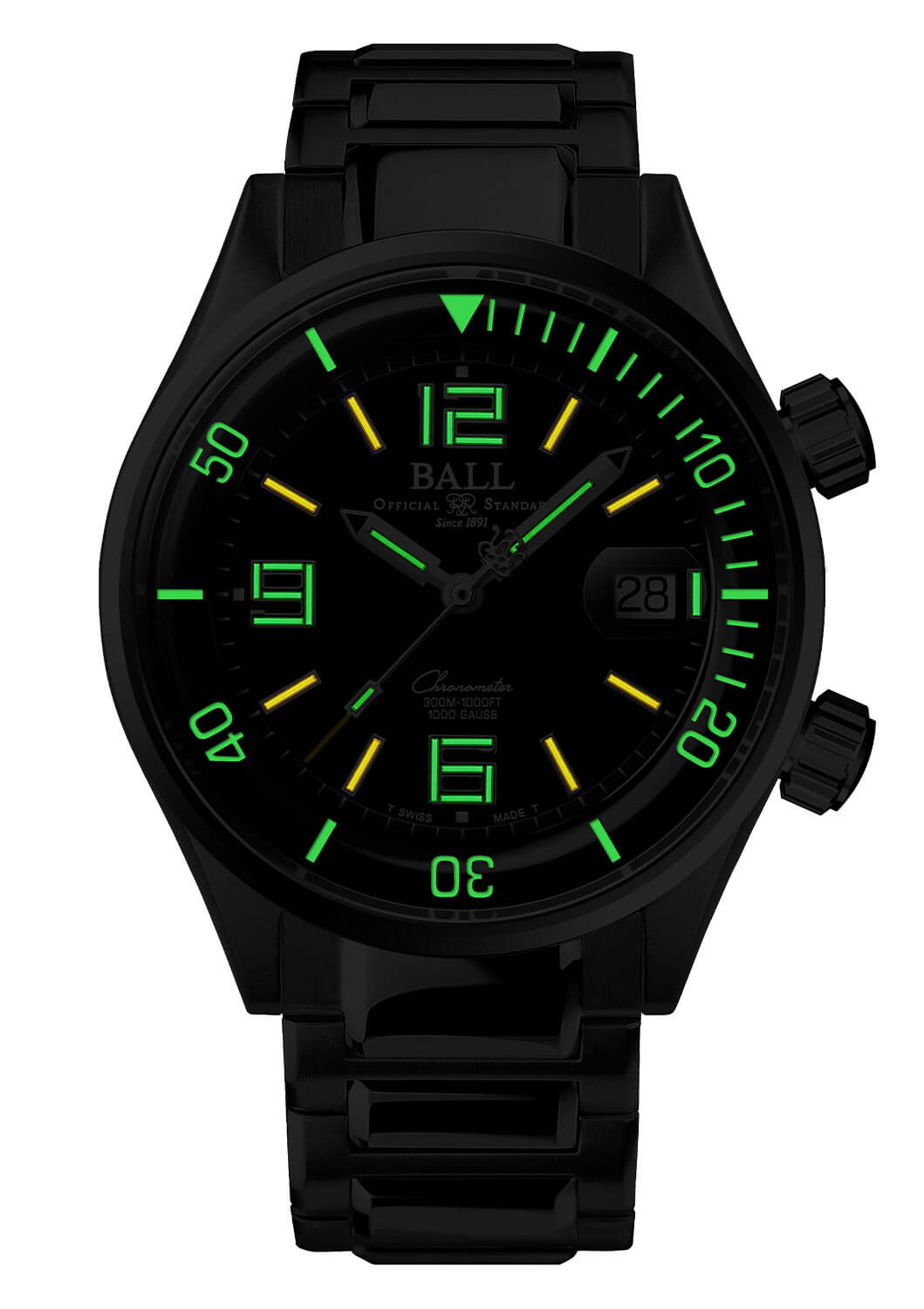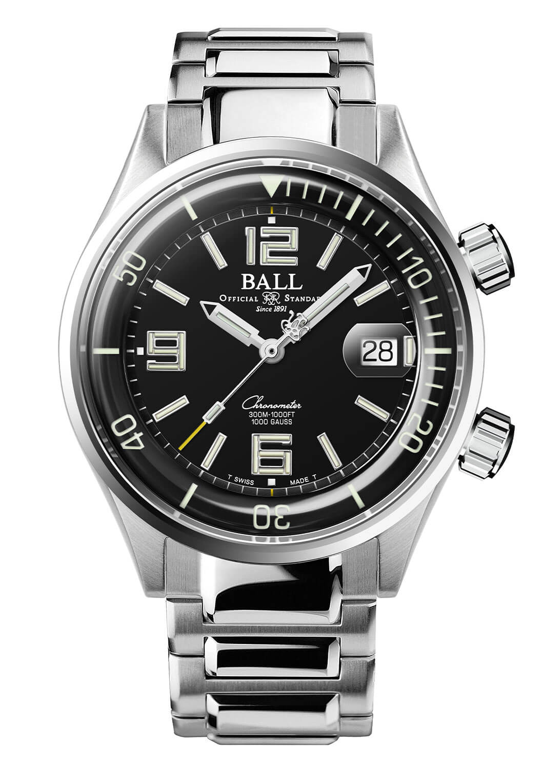 Pouzdro o průměru 42 mm vyrobené z nerezové oceli poskytuje dokonalou kombinaci pevnosti a pohodlí při nošení. Celek doplňuje safírové sklíčko s působivou tloušťkou 2.6 mm, které chrání ciferník proti poškrábání a poškození. Automatické hodinky Ball Ballistic DM2280AS6CBK, navržené s ohledem na profesionální potápěče a nadšence extrémního dobrodružství, jsou díky patentovanému systému Amortiser® odolné proti nárazu až 5 000 Gs. To není vše – jeho odolnost vůči magnetickým polím dosahuje 80 000 A/m, díky čemuž si dokonale poradí i s nejnáročnějšími podmínkami. Vnitřní potápěčská luneta, ovládaná šroubovací korunkou ve dvě hodiny, umožňuje přesné měření dekompresního času a zajišťuje spolehlivost při každém ponoru až do hloubky 300 metrů. Takové inovace dokazují, že se Ball nebojí prolomit bariéry.