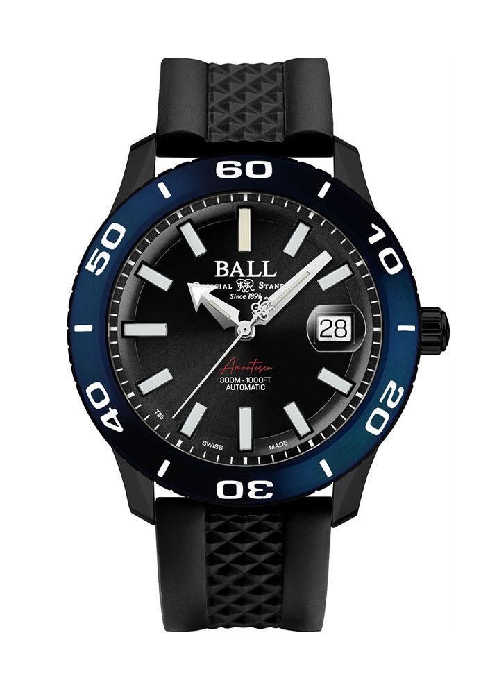Hodinky ve vojenském stylu Ball jsou vyrobeny z nerezové oceli, díky čemuž jsou odolné a odolné vůči poškození. Pouzdro je u tohoto modelu navíc vyztuženo černým PVD povlakem. Prezentované hodinky Ball jsou nabízeny ve velikosti 40,50 mm na gumovém pásku. Velikost umožní, aby hodinky padly na každé pánské zápěstí a řemínek zajistí pohodlí i při používání tohoto modelu. Měkký a pružný řemínek je voděodolný. Vysoká voděodolnost až do 300 metrů znamená, že diverské hodinky Ball lze vzít na průzkum pod vodou bez obav z poškození. Šroubovací korunka, tradičně umístěná na pravé straně, a šroubovací pouzdro jsou mimořádně důležité prvky zajišťující celou konstrukci. Při potápění bude užitečným doplňkem otočná luneta. Na přední straně pouzdra hodinek je umístěna luneta s čitelnou minutovou stupnicí na modrém kroužku.