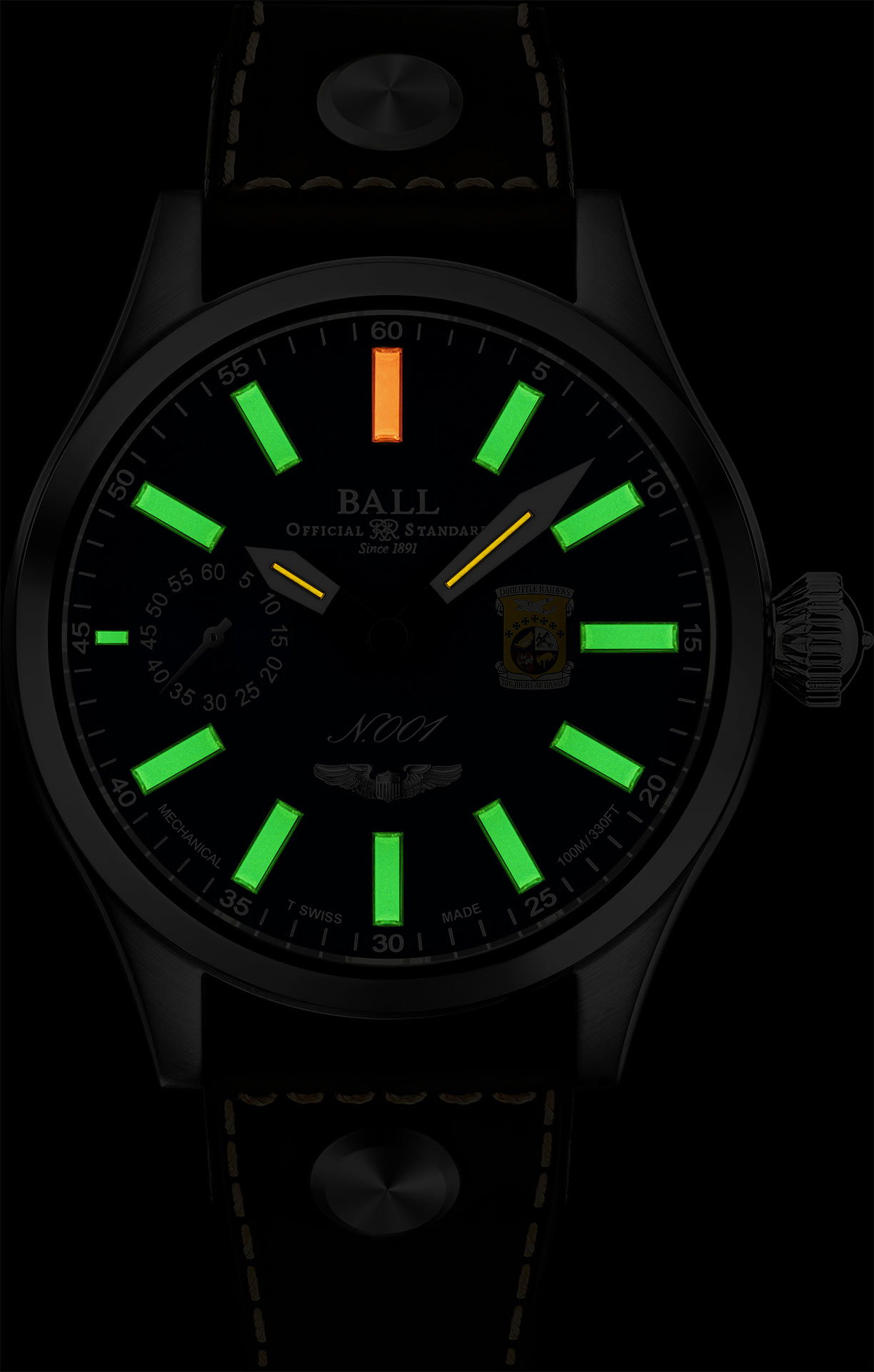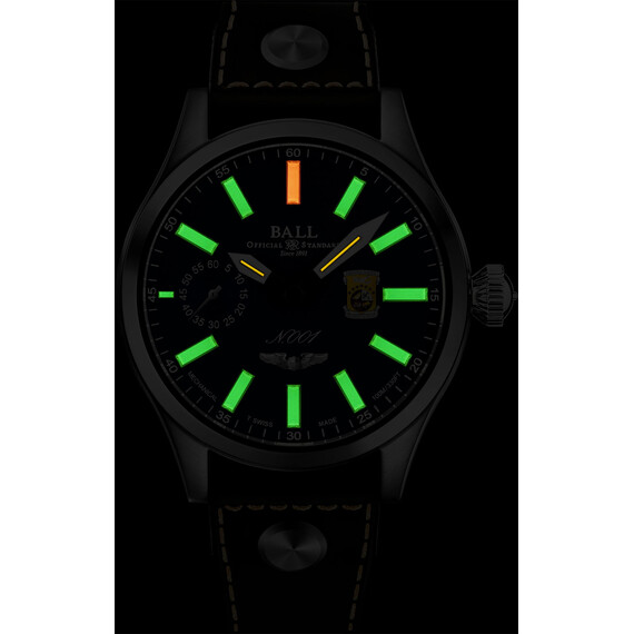 Ciferník vojenských hodinek Ball NM2638C-L1-BE zdobí originální emblém Doolittle Raiders a Navy Aviator Wings. Číslo limitované edice je nakresleno na číselníku, zatímco zbytek designu je zkrácen tak, aby obsahoval pouze podstatné, čitelné prvky, které vám umožní soustředit se na odečítání času. Letci potřebují velké a jasné hodinky. Pro splnění této výzvy poskytla společnost BALL Watch Company indexy a ručičky leteckých hodinek řady Engineer Master II Doolittle Raiders s plynovými mikrotrubičkami H₃. Díky této nejmodernější švýcarské technologii je číselník dokonale viditelný i v naprosté tmě. Plynové trubice Micro H₃ nevyžadují přístup k žádnému externímu zdroji energie a svítí až 25 let s intenzitou stokrát jasnější než svítivá látka tradičně používaná v hodinářském průmyslu. Široké trubice použité pro indexy mají světle zelený nádech a oranžovou na 12. hodině, zatímco ty na indikacích svítí žlutě. Díky optimalizovanému rozvržení je díky sérii Engineer Master II Doolittle Raiders vyprávění příběhu času ve tmě brilantně snadné. 46mm verze se vyznačuje exkluzivně zdobeným ručně vinutým švýcarským Machinekem s hodinovými a minutovými ručičkami a malými vteřinami na 9. hodině Hodinky jsou uloženy v robustním a odolném nerezovém pouzdře, které je odolné proti nárazům až do 5 000 G a max. 4 800 A pro magnetická pole. Zadní strana pouzdra je zasklena safírovým sklem. Celek byl zavěšen na stylovém hnědém koženém řemínku zapínaném tradiční ocelovou přezkou.