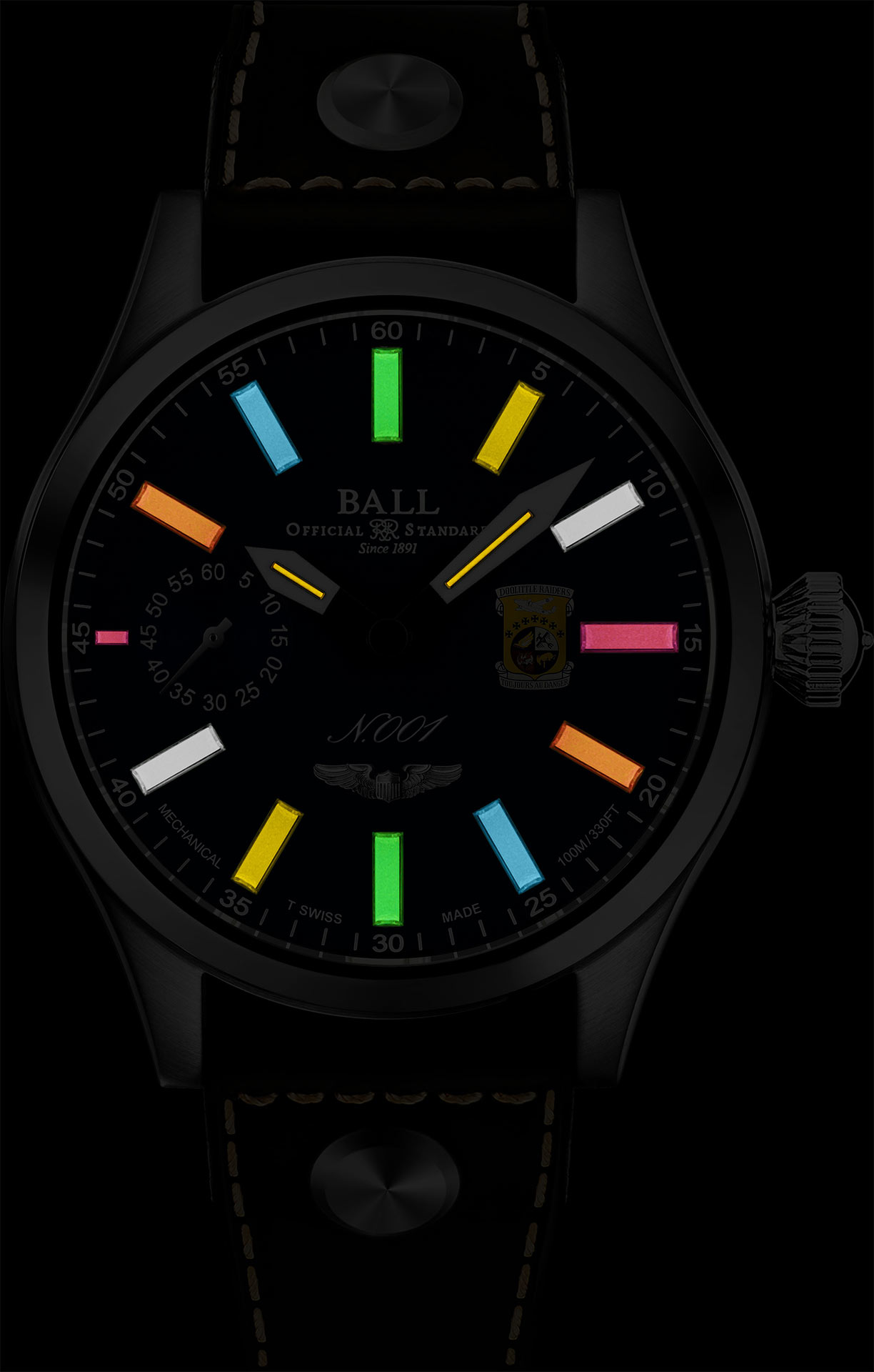 Ciferník vojenských hodinek Ball NM2638C-L1-BER zdobí originální emblém Doolittle Raiders a Navy Aviator Wings. Číslo limitované edice je nakresleno na číselníku, zatímco zbytek designu je zkrácen tak, aby obsahoval pouze podstatné, čitelné prvky, které vám umožní soustředit se na odečítání času. Letci potřebují velké a jasné hodinky. Aby společnost BALL Watch Company splnila tuto výzvu, poskytla indexy a informace o sérii Engineer Master II Doolittle Raiders s plynovými trubicemi micro H₃. Díky této nejmodernější švýcarské technologii je číselník dokonale viditelný i v naprosté tmě. Plynové trubice Micro H₃ nevyžadují přístup k žádnému externímu zdroji energie a svítí až 25 let s intenzitou stokrát jasnější než svítivá látka tradičně používaná v hodinářském průmyslu. Široké trubky použité pro indexy mají jedinečné odstíny duhy. Díky optimalizovanému rozvržení série leteckých hodinek Engineer Master II Doolittle Raiders geniálně usnadňuje vyprávění příběhu času ve tmě. 46mm verze se vyznačuje exkluzivně zdobeným ručně vinutým švýcarským Machinekem s hodinovými a minutovými ručičkami a malými vteřinami na 9. hodině Hodinky jsou uloženy v robustním a odolném nerezovém pouzdře, které je odolné proti nárazům až do 5 000 G a max. 4 800 A pro magnetická pole. Zadní strana pouzdra je zasklena safírovým sklem. Celek byl zavěšen na stylovém hnědém koženém řemínku zapínaném tradiční ocelovou přezkou.