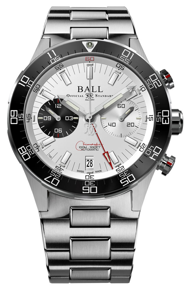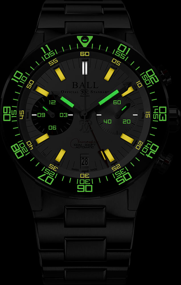 60minutový chronograf (stopky) má centrální červenou minutovou ručku a bílou vteřinovku. Díky novému internímu kalibru BALL RRM7338-C nabízí funkce chronografu celkovou dobu měření až 12 hodin, jak ukazuje subčíselník na 9. hodině. Funkce, pánské hodinky s chronografem Ball poskytují dynamickou použitelnost vůbec časy.
