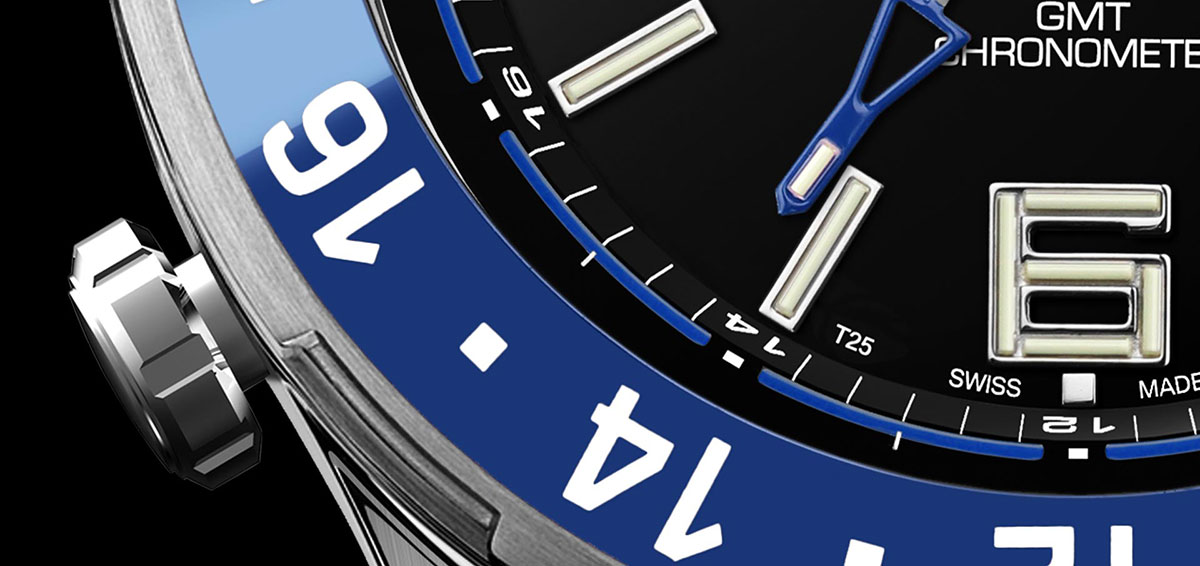 Se třemi časovými pásmy vás zve na globální dobrodružství. Hodinky jsou vybaveny chytrými tlačítky pro rychlou korekci času ve druhém časovém pásmu. Vestavěné plynové mikrotrubičky zajišťují čitelnost i ve tmě. Modročerná vložka otočného kroužku je vyrobena ze slinuté keramiky, zajišťující barevnou stálost a odolnost proti poškrábání. Luneta se otáčí ve dvou směrech a její spolehlivý mechanismus udělá z každého otočení potěšení.
