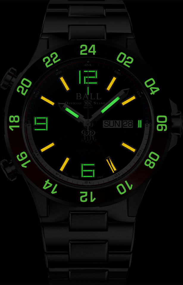 Swiss Ball Roadmaster Marine GMT Automatic jsou hodinky pro ty, kteří oceňují odolnost. Pevné pouzdro o průměru 42 mm, vyrobené z nejkvalitnějšího titanu, tvoří s titanovým náramkem harmonický celek. Na přední straně pouzdra je na keramické vložce obousměrně otočná luneta s časovou stupnicí 12/24 hodin. Tento nejnovější přírůstek do kolekce Roadmaster Marine GMT je vyroben tak, aby vydržel extrémní podmínky. Hodinky Ball jsou antimagnetické a nárazuvzdorné, což zaručuje nejen přesnost, ale i odolnost. Zadní strana hodinek má zadní šroubovací pouzdro s průhledným okénkem. Umožňuje vám sledovat vlastní automatický pohyb Ball GMT s certifikátem přesného chodu COSC. Certifikát získaný po důkladných testech mechanismu potvrzuje nejvyšší přesnost této unikátní hodinky.
