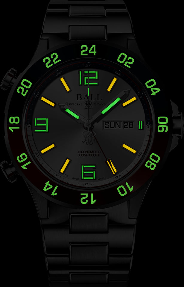 Swiss Ball Roadmaster Marine GMT Automatic jsou hodinky pro ty, kteří oceňují odolnost. Pevné pouzdro o průměru 42 mm, vyrobené z nejkvalitnějšího titanu, tvoří s titanovým náramkem harmonický celek. Na přední straně pouzdra je na keramické vložce obousměrně otočná luneta s časovou stupnicí 12/24 hodin. Tento nejnovější přírůstek do kolekce Roadmaster Marine GMT je vyroben tak, aby vydržel extrémní podmínky. Hodinky Ball jsou antimagnetické a nárazuvzdorné, což zaručuje nejen přesnost, ale i odolnost. Zadní strana hodinek má šroubovací pouzdro s průhledným okénkem. Umožňuje vám sledovat vlastní automatický pohyb Ball GMT s certifikátem přesného chodu COSC. Certifikát získaný po důkladných testech mechanismu potvrzuje nejvyšší přesnost této unikátní hodinky.