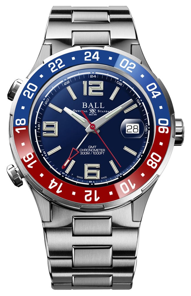 Ball Roadmaster Pilot GMT Limited Edition má tři časová pásma, která vás zvou na globální dobrodružství. Model je vybaven patentovanými chytrými tlačítky pro rychlou korekci času ve druhém časovém pásmu. Vestavěné revoluční plynové mikrotrubičky H3 zajišťují čitelnost i v úplné tmě. Modro-červená vložka otočného kroužku je vyrobena ze slinuté keramiky, zajišťující barevnou stálost a odolnost proti poškrábání. Luneta se otáčí ve dvou směrech a má luminiscenční podsvícení. Výše uvedené pánské náramkové hodinky jsou nejnovějším přírůstkem do řady Roadmaster Pilot GMT. Model je navržen tak, aby přesně ukazoval čas bez ohledu na převládající vnější podmínky, i ty extrémní. Přesnost indikací je potvrzena oficiálním certifikátem chronometru COSC.