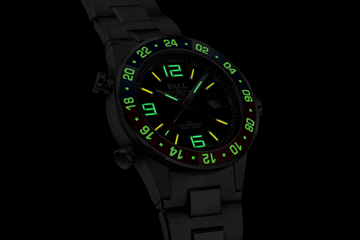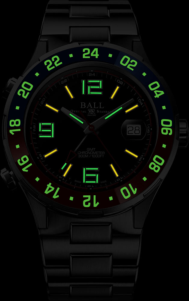 Chronometr Swiss Ball Roadmaster Pilot GMT má pouzdro vyrobené z titanu, které díky své lehkosti umožňuje intenzivní průzkum naší zeměBALL. Díky průkopnickému přístupu k luminiscenci zajistí mikrotrubičky plněné 3H plynem dokonalé čtení indikací v plné tmě. Svítí až 100x jasněji než běžná luminiscenční látka a hlavně nevyžadují externí zdroj světla. Keramická vložka má zase aplikace z vysoce kvalitní fluorescenční látky - Super-LumiNova®, která umožňuje volné čtení třetí zóny v naprosté tmě.