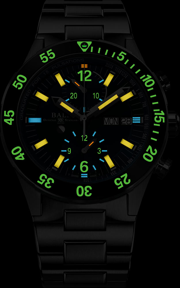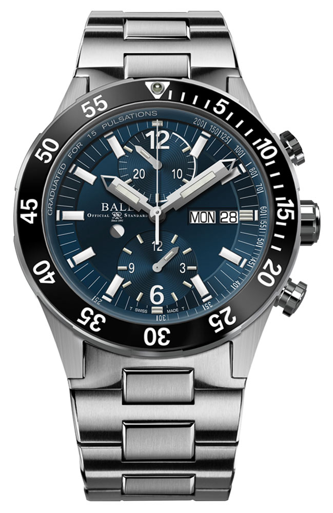 Stopky lze ovládat pomocí dvou tlačítek vybavených patentovaným zámkovým systémem Ball Watch. Stačí otočit tlačítky, abyste zámek zvedli a zapnuli, a poté je znovu otočte, abyste odstranili riziko neúmyslné manipulace. Ručička chronografu spolupracuje s 15-pulzní stupnicí monitoru srdečního tepu a rychle změří vaši srdeční frekvenci. Chcete-li spustit systém srdeční frekvence, spusťte stopky a počítejte srdeční tep. Zastavte chronograf, když udeří 15. úder. Indikace vás bude informovat o rozsahu a frekvenci pulsu za minutu. Kromě stupnice monitoru srdečního tepu mohou stopky sledovat dlouhé časové úseky. Tote ve 12 hodin je 30minutové počítadlo, zatímco tote v 6 hodin je 12hodinové počítadlo. Hodinky jsou zavěšeny na náramku, který je lehčí než ten tradiční, protože má nejen ocelové, ale i titanové články.