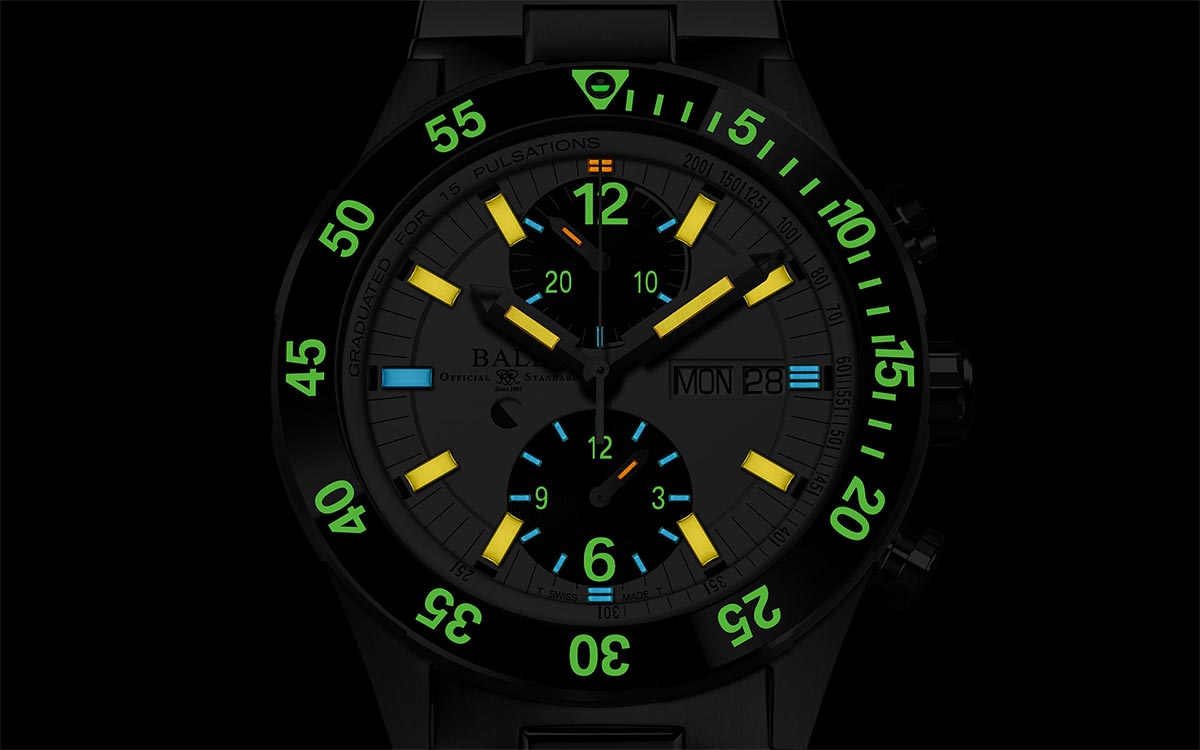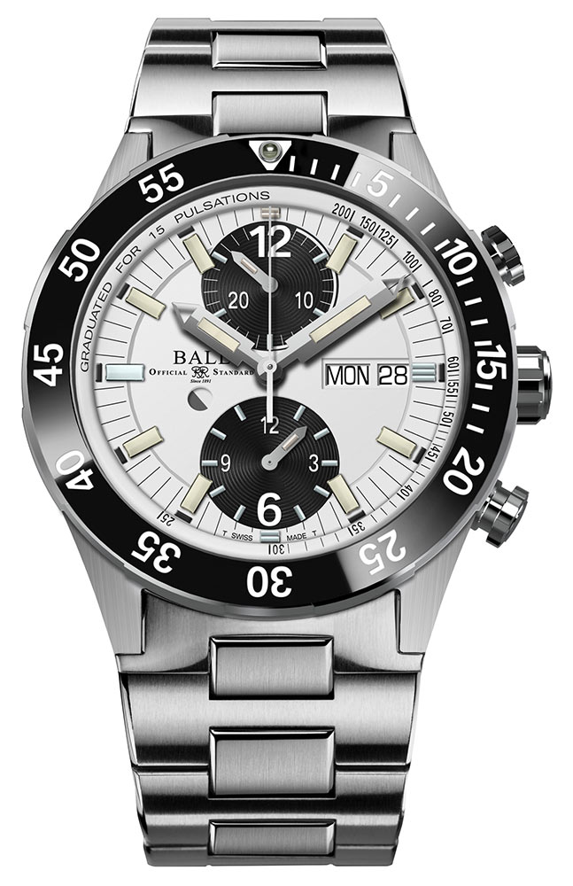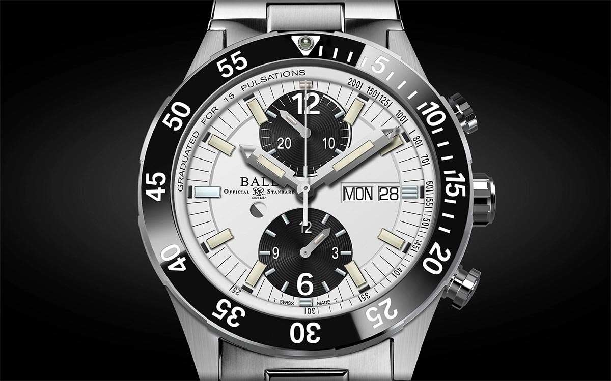 Stopky lze ovládat pomocí dvou tlačítek vybavených patentovaným zámkovým systémem Ball Watch. Stačí otočit tlačítky, abyste zámek zvedli a zapnuli, a poté je znovu otočte, abyste odstranili riziko neúmyslné manipulace. Ručička chronografu spolupracuje s 15-pulzní stupnicí monitoru srdečního tepu a rychle změří vaši srdeční frekvenci. Chcete-li spustit systém srdeční frekvence,spusťte stopky a počítejte srdeční tep. Zastavte chronograf, když udeří 15. úder. Indikace vás bude informovat o rozsahu a frekvenci pulsu za minutu. Kromě stupnice monitoru srdečního tepu mohou stopky sledovat dlouhé časové úseky. Tote ve 12 hodin je 30minutové počítadlo, zatímco tote v 6 hodin je 12hodinové počítadlo. Hodinky jsou zavěšeny na náramku, který je lehčí než ten tradiční, protože má nejen ocelové, ale i titanové články.