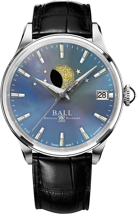 Dámské hodinky Ball Trainmaster Moon Phase mají automatický Machineek Ball RR1801 umístěný v kulatém leštěném pouzdře o průměru 34 mm. Fáze měsíce dodávají nádech elegance a fascinují moderním designem. Modrý perleťový ciferník zdobí leštěné hvězdičky. Pro obnovení měsíčního svitu na číselníku je ústřední komplikací 26 tritiových tyčinek, které svítí bez externího zdroje světla. Pro dokonalé odečítání času i v naprosté tmě byly na indexy a ručičky přidány tyčinky s tritiovým plynem. Velká vroubkovaná korunka umožňuje snadné nastavení indikací a dodává jedinečný styl. Skleněná zadní strana hodinek odhaluje krásně zdobený mechanismus, který dodává pečlivou eleganci.