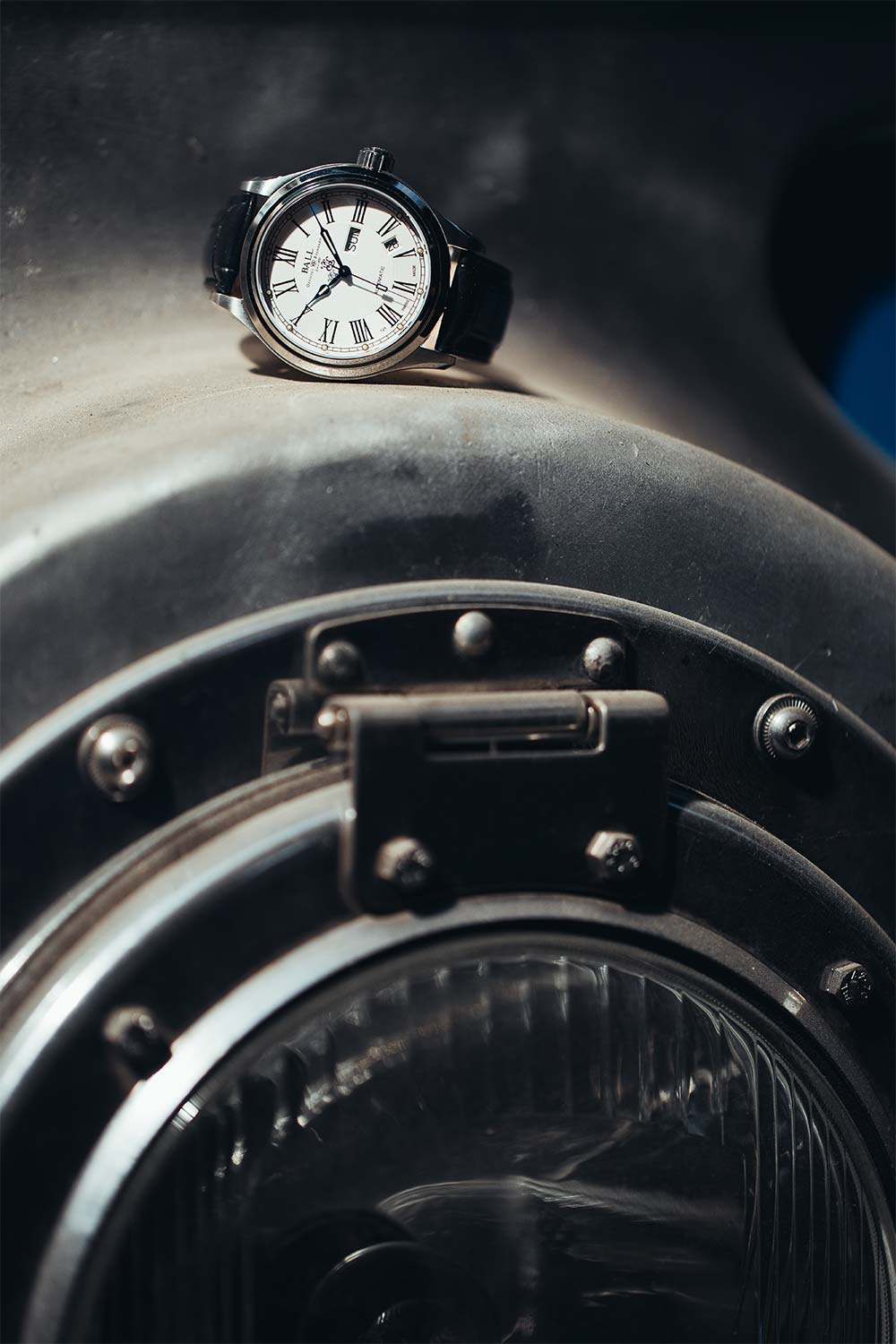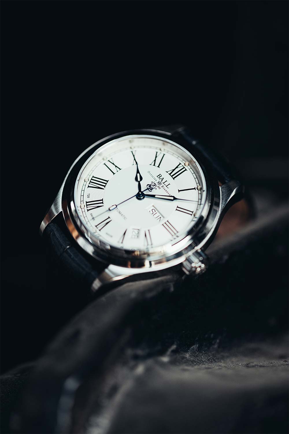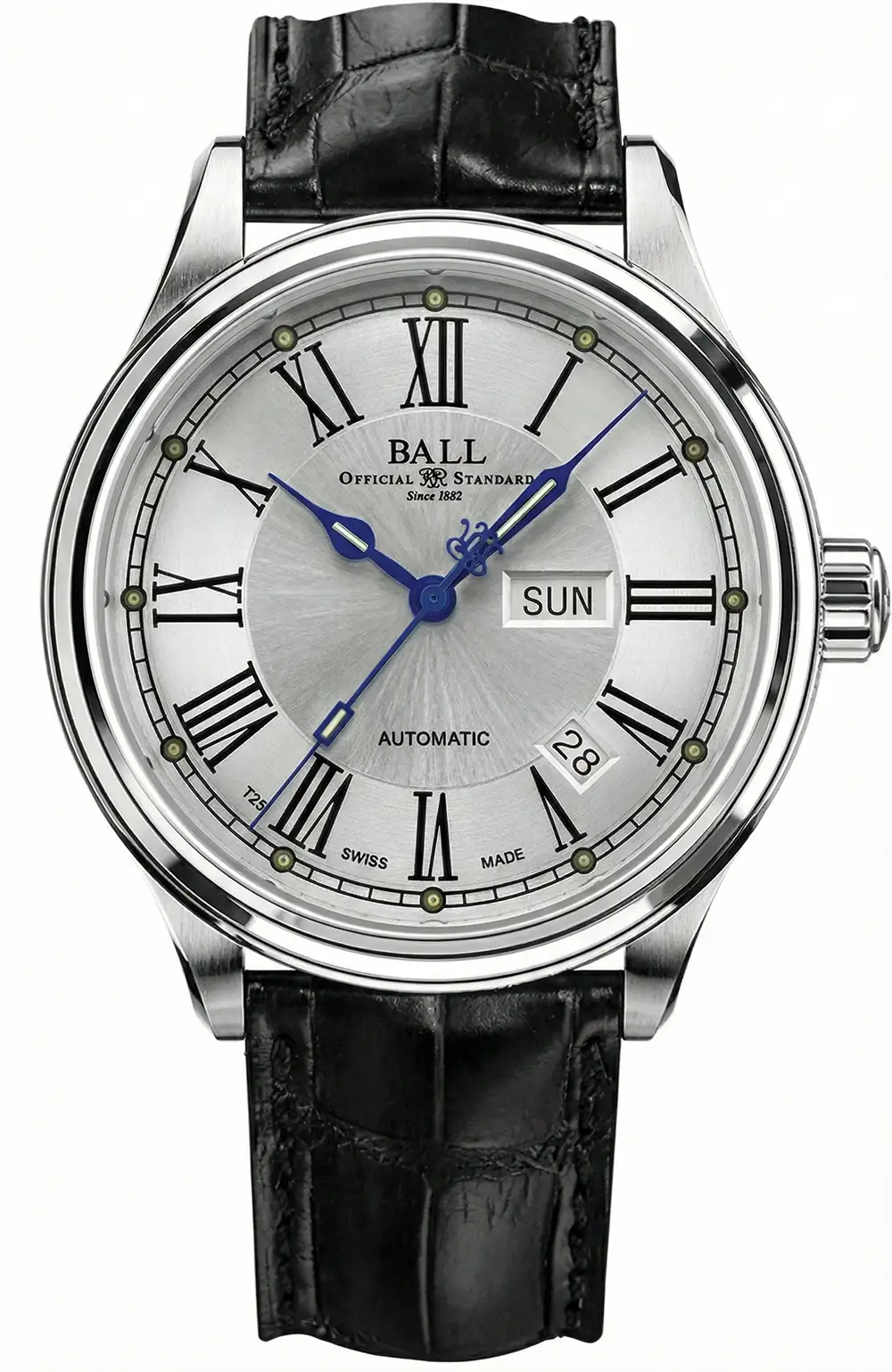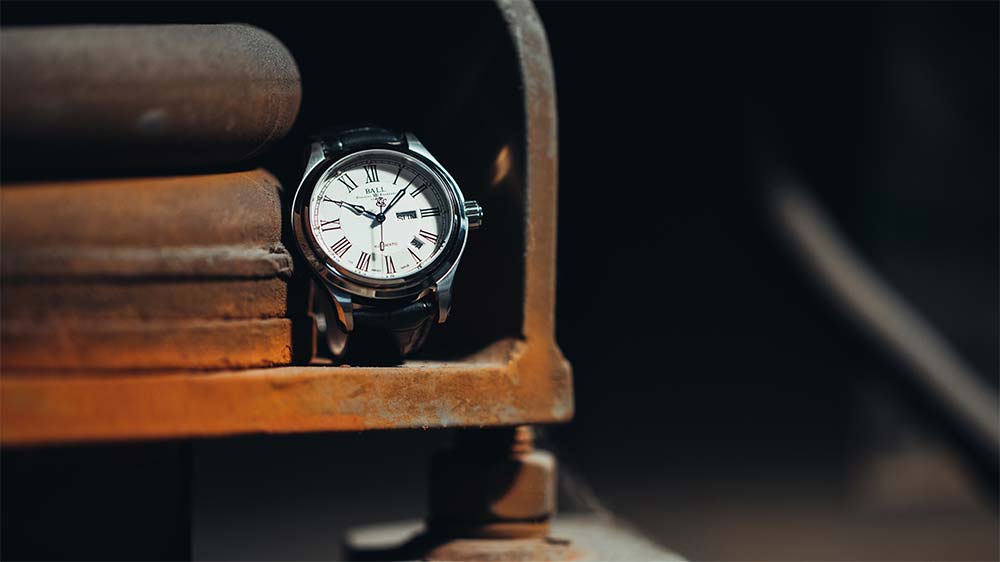 Ball Trainmaster Roman NM1058D-L4J-WH jsou funkční a atraktivní retro hodinky. Pouzdro z nerezové oceli o průměru 41 mm v kombinaci s ciferníkem s římskými číslicemi dodává hodinkám jedinečný vzhled. Krásné, klasické ručičky mají tritiové mikro-plynové tyčinky, které najdeme i ve formě kuliček u indexů. Uvnitř hodinek je přesný automatický Machineek Ball RR1102 s funkcí dvojitého data.
