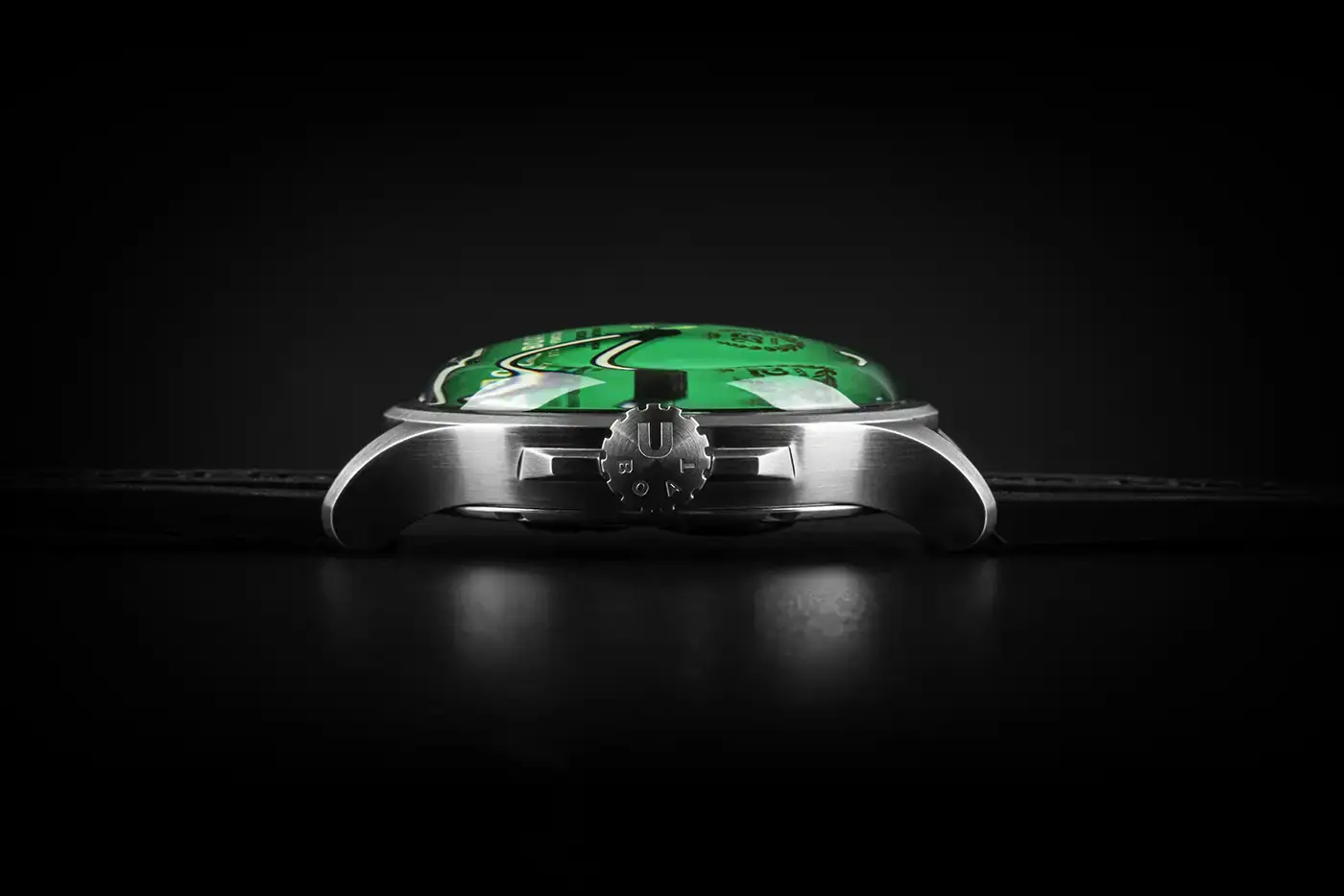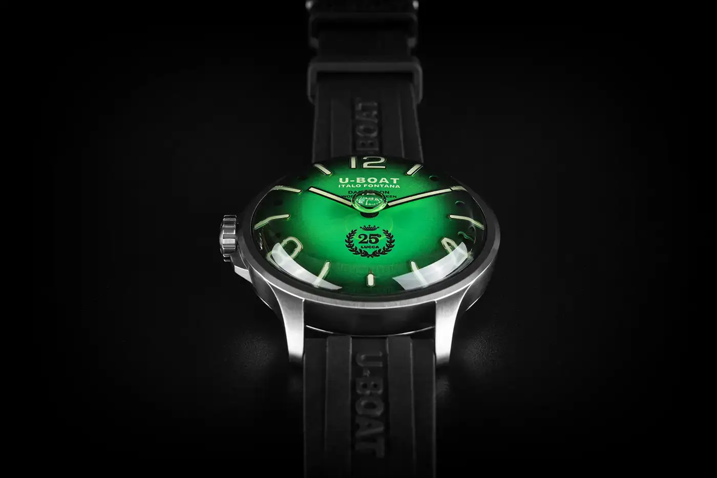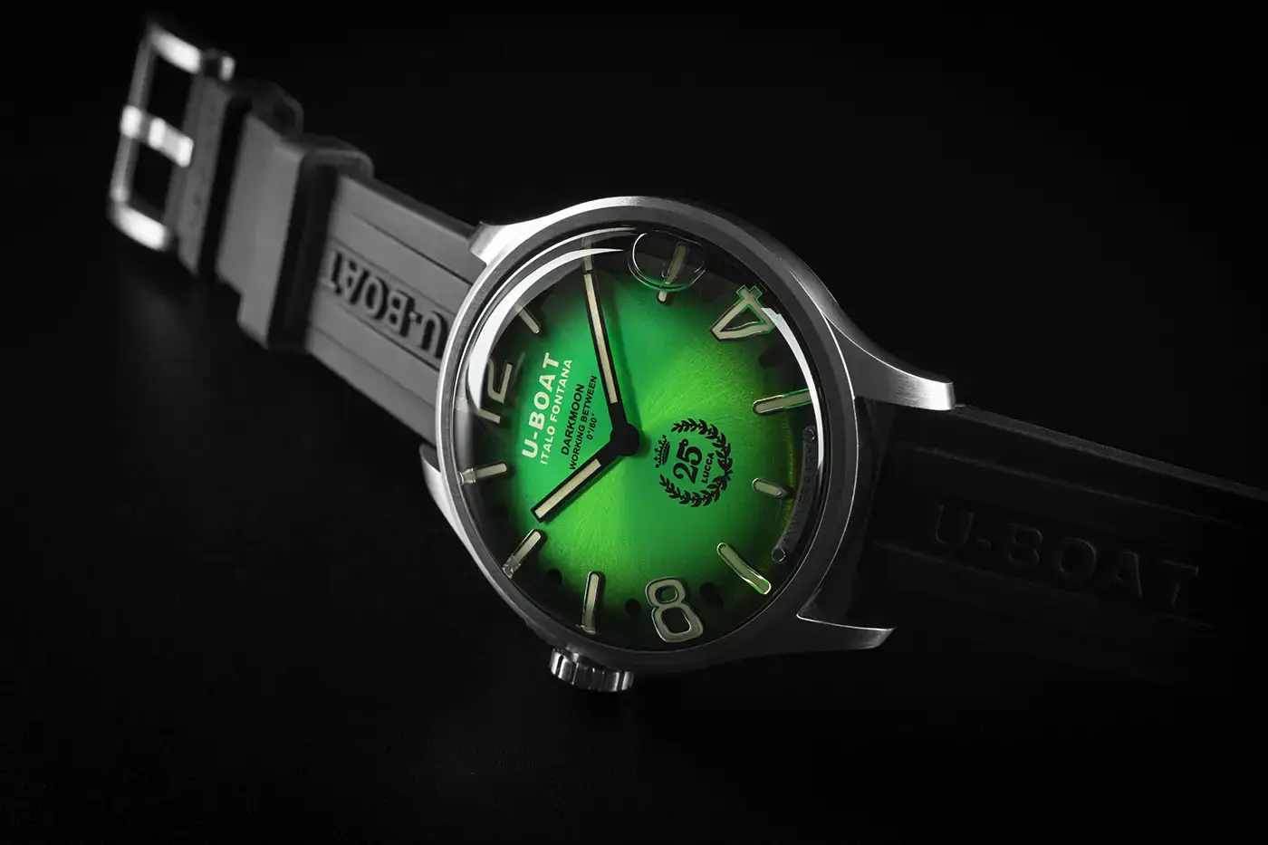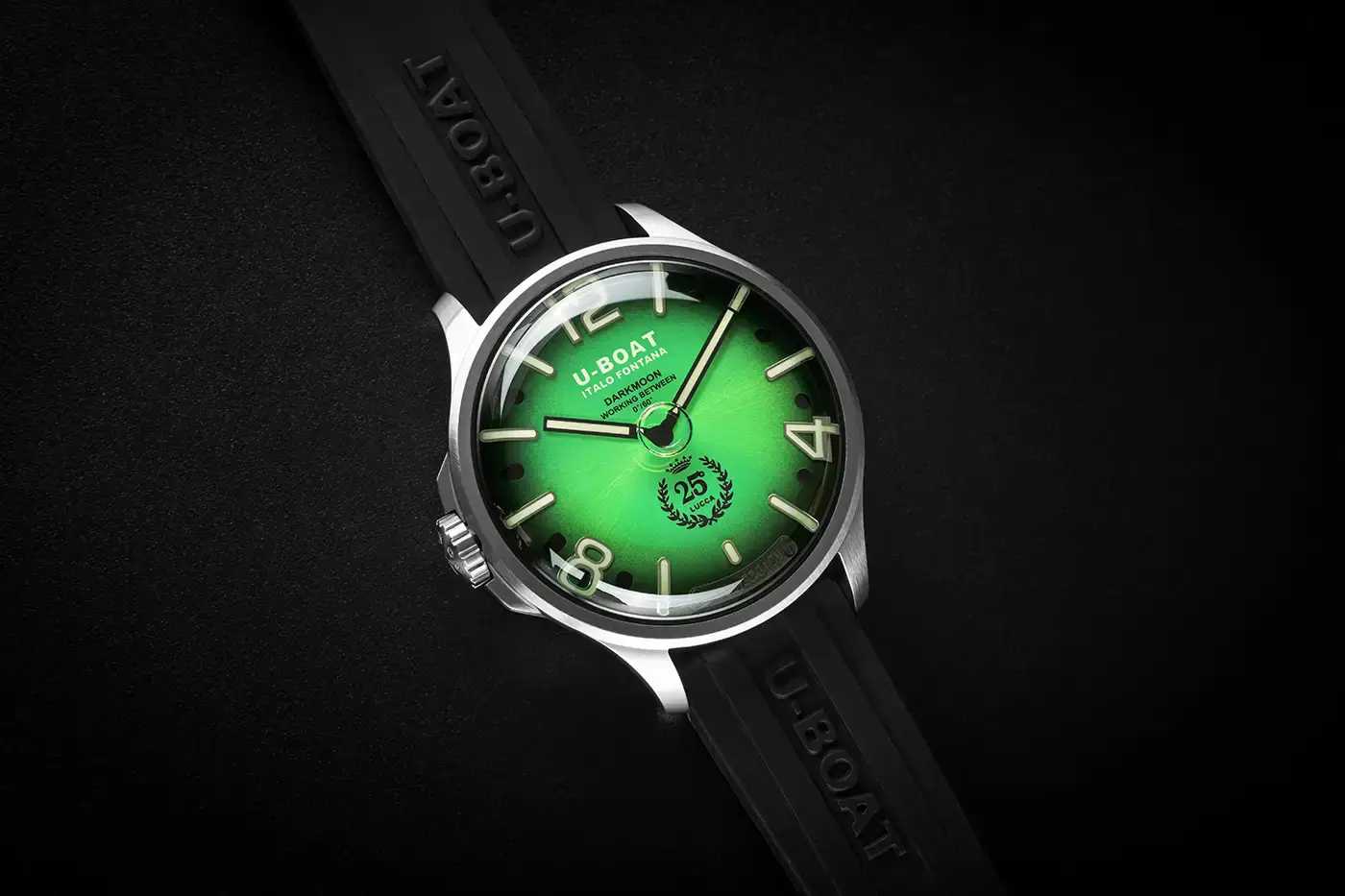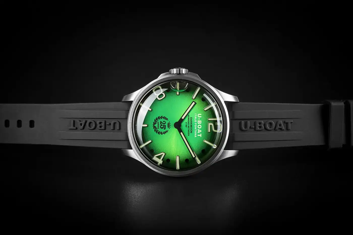 U-BOAT Darkmoon 25° Anniversary SS Green Soleil jsou hodinky s olejem o impozantním průměru 46,5 mm, určené pro znalce hledající výjimečný styl a technologickou rafinovanost. Pásek z extrémně odolné vulkanizované pryže, zdobený reliéfním logem značky, dotváří celek a nabízí nepřekonatelné pohodlí při nošení a vysokou vnímanou hodnotu.