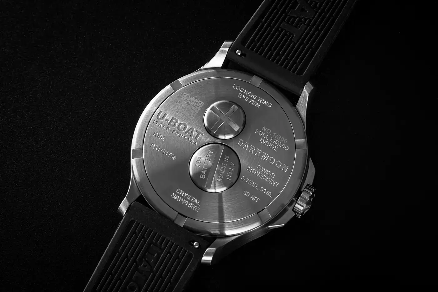 Hodinky U-BOAT ponořené v oleji jsou vyrobeny z nejkvalitnější nerezové oceli AISI 316L, která zdůrazňuje surovou eleganci designu a harmonicky ladí se zeleným číselníkem s gradientním efektem. Křemíkový strojek Ronda 762, zapouzdřený v oleji, zajišťuje nejen vynikající přesnost, ale také jedinečný optický efekt, jako by sklíčko zmizelo a zanechalo pouze čistý obraz času. Dýnko hodinek, které jsou vodotěsné do hloubky přibližně 50 metrů (sprcha/koupel), ukrývá inovativní systém rychlé výměny baterie. Je doplněno o laserem gravírované sériové číslo a QR kód, který zpřístupňuje exkluzivní digitální verzi — důkaz pravosti a jedinečnosti každého kusu.