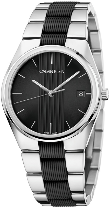 Pánské hodinky Calvin Klein Contrast K9E211B1 v nestandardním retro stylu. Podél černého ciferníku jsou svislé černé pruhy, které plynule procházejí ozdobnými silikonovými články k náramku z nerezové oceli. Kulaté pouzdro o průměru 40 mm je nahoře uzavřeno safírovým sklíčkem odolným proti poškrábání. O přesné měření času se stará quartzový Machineek ETA F07.111 s funkcí data.