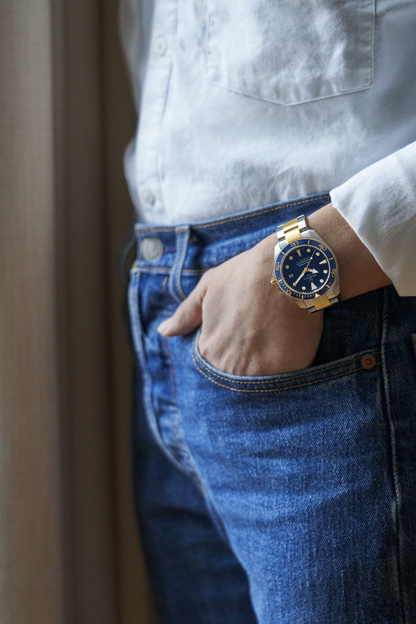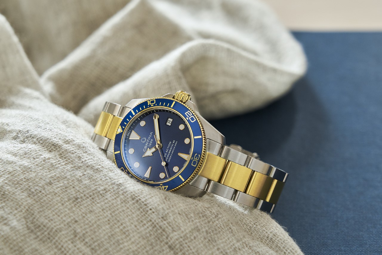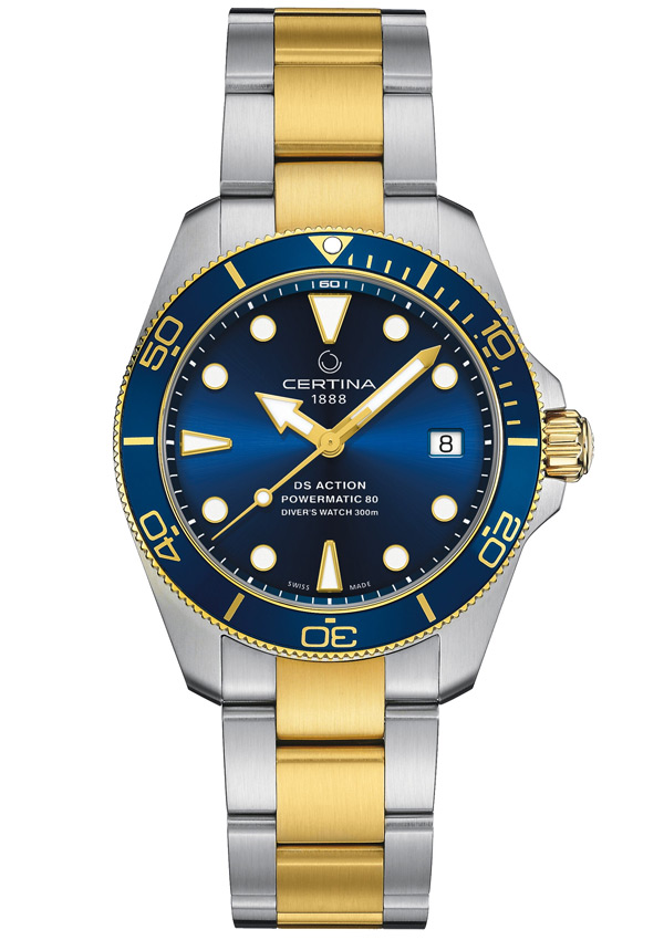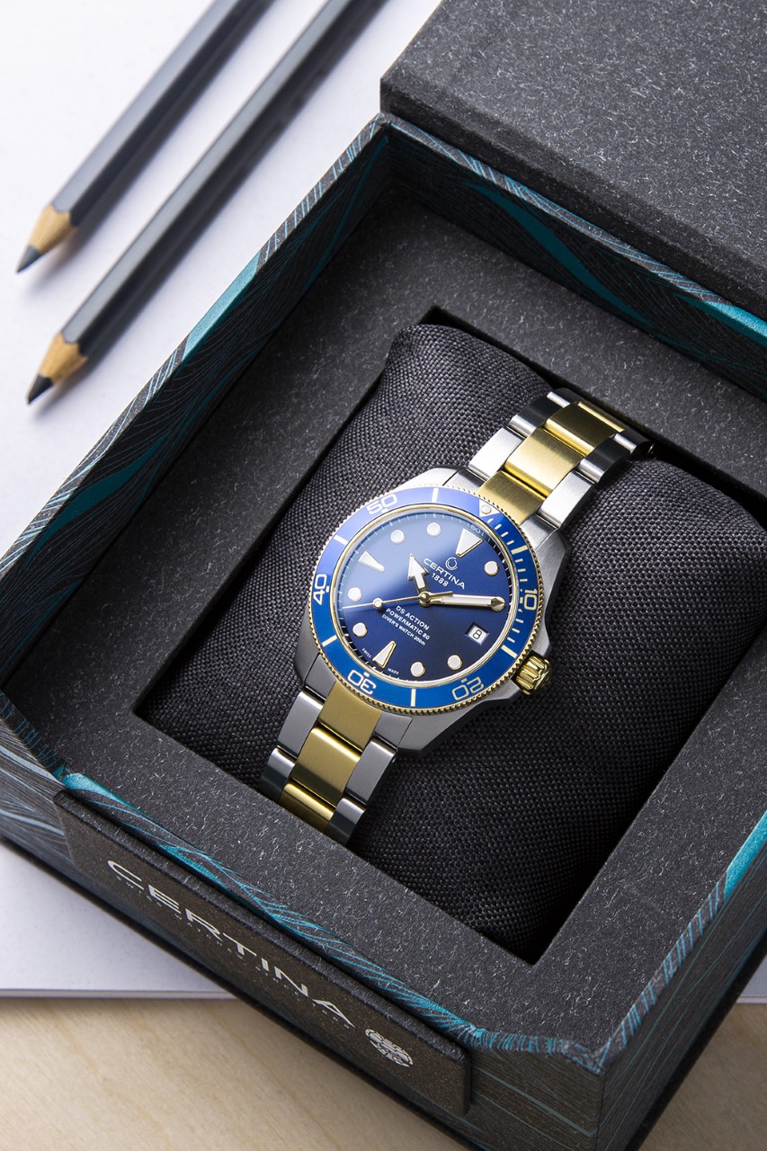 V limitované, ale nečíslované edici Certina DS Action Diver splňují – stejně jako ostatní modely – požadavky omezující normy ISO 6425 pro diverské hodinky. Kruh dalekohledu je vyroben z lehkého, odolného a hypoalergenního hliníku. Diverské značky hodin a ručičky Broad Arrow jsou vyplněny ve tmě svítícím Super-LumiNova, zatímco ciferník je chráněn nejkvalitnějším safírovým sklem odolným proti poškrábání s antireflexní vrstvou na vnitřní straně. Pouzdro je vyrobeno z nerezové oceli 316L a na některých místech je potaženo moderní metodou PVD (Physical Vapor Deposition) vrstvou žlutého zlata.