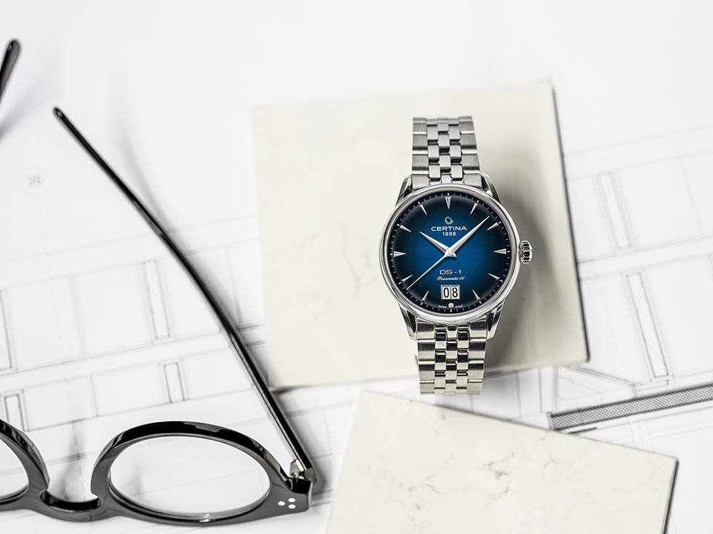 Hovoříme o zajímavých hodinkách, které jsou rozšířením kolekce CERTINA DS-1 mezi švýcarské lídry v kvalitě. Tyto exkluzivní, automatické hodinky překvapí téměř na každém kroku – skrývá některé z nejpokročilejších hodinářských technologií – a přitom si zachovává konzistentní a nenápadný obraz. Barevná škála je omezena pouze na dvě barvy - modrý ciferník , na kterém jsou perfektně vidět minimalistické ukazatele hodin, a stříbrný ocelový náramek , který k ciferníku dokonale ladí a je nenápadný. Sklíčko ciferníku ze safírového skla zase vykazuje nejvyšší odolnost proti poškrábání, navíc zaručuje nadprůměrnou průhlednost a čitelnost i přes různé sluneční podmínky - díky přítomnosti antireflexní vrstvy. Hodinky mají také datumovku a bezpečnou motýlkovou sponu se dvěma tlačítky.