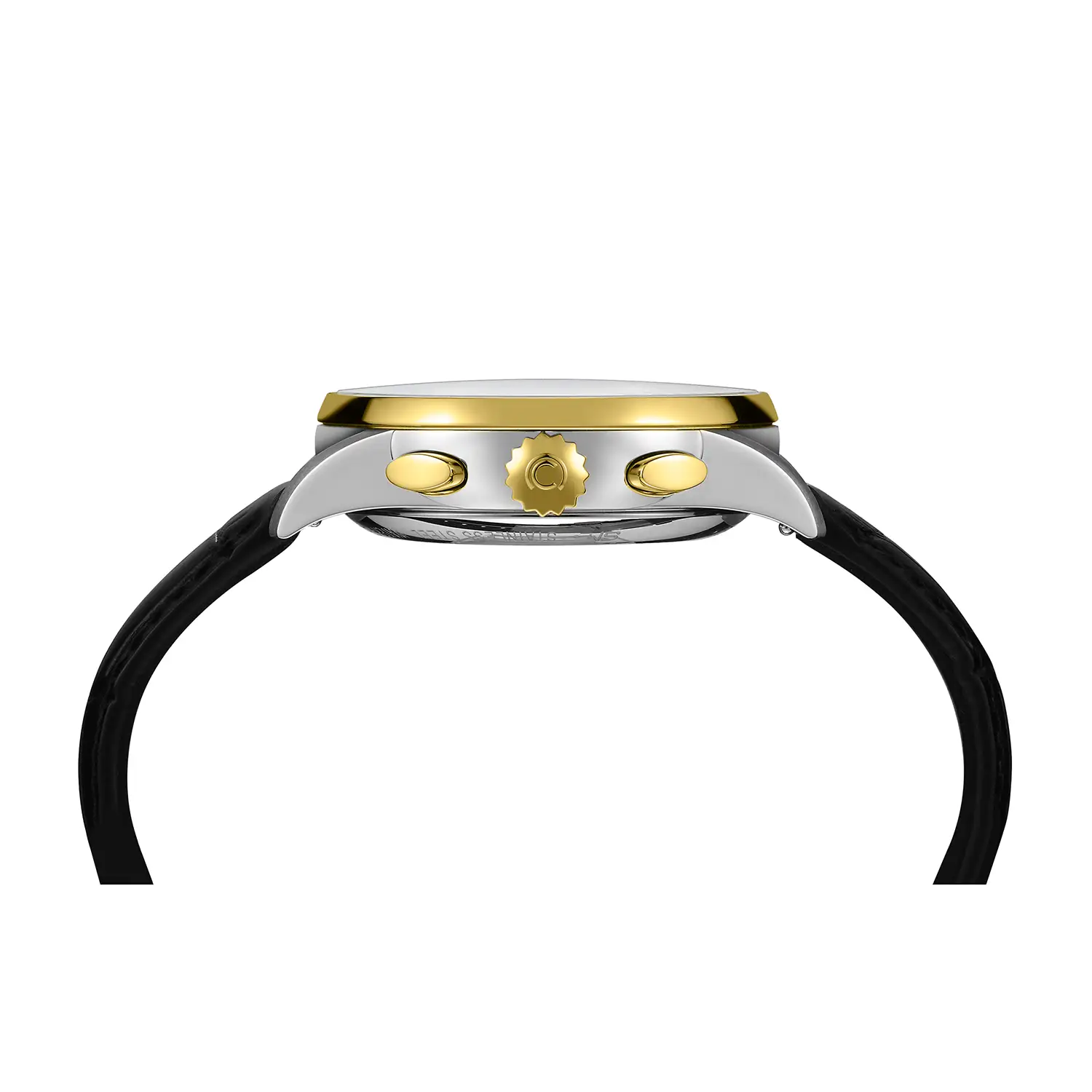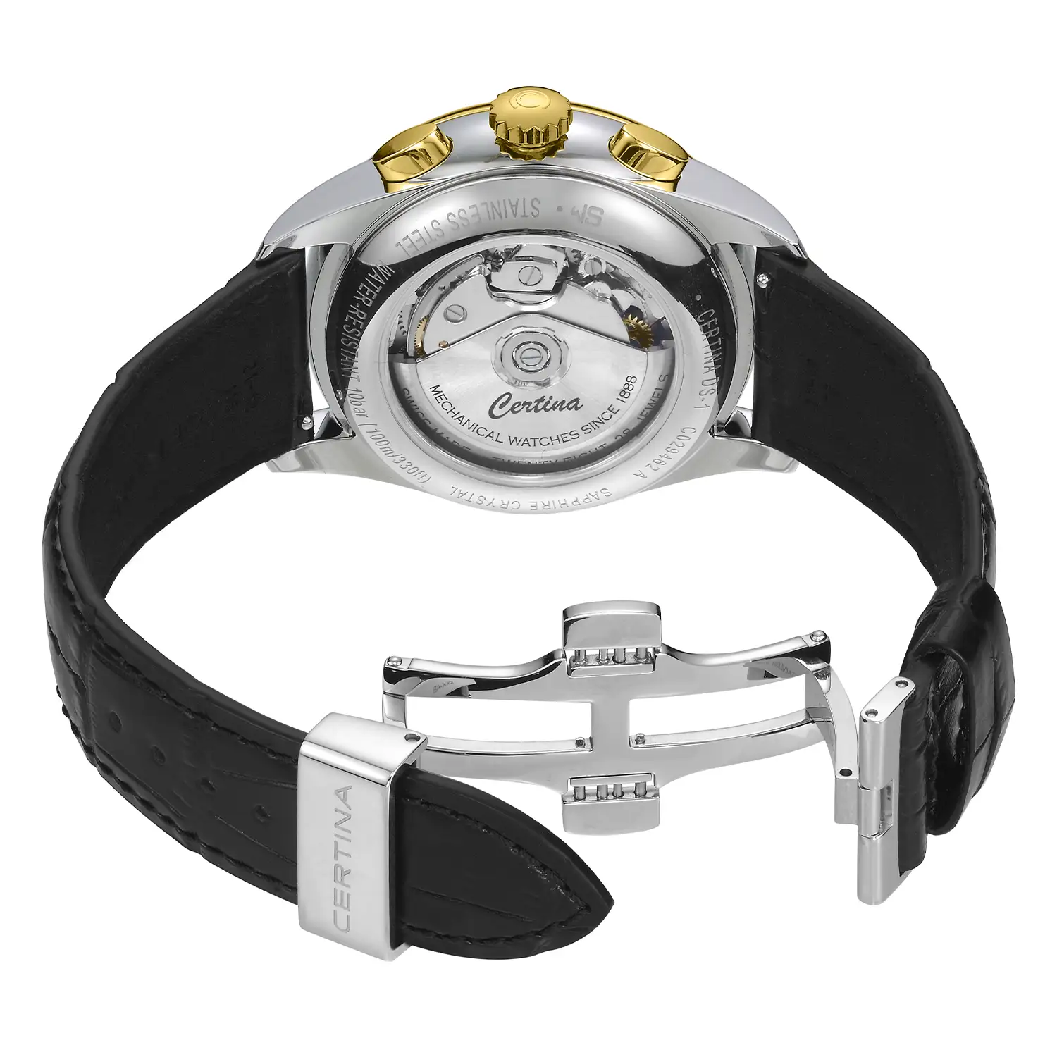 Pánské hodinky Certina DS-1 Chrono Auto C029.462.26.051.00 jsou výjimečný model, který už na první pohled budí respekt. Robustní pouzdro bicolor spojuje chlad oceli s teplem pozlacených akcentů a vytváří výraznou, ale nepřehnanou kompozici. Černý ciferník s uspořádáním chronografu a tachymetrickou stupnicí evokuje ducha klasických závodů, a zároveň si zachovává eleganci, která se bez námahy ukryje pod manžetou košile. Představovaný časoměřič je určen především pro muže citlivého na detail, který nehledá jen funkci stopek, ale také hodinky s charakterem a historií.