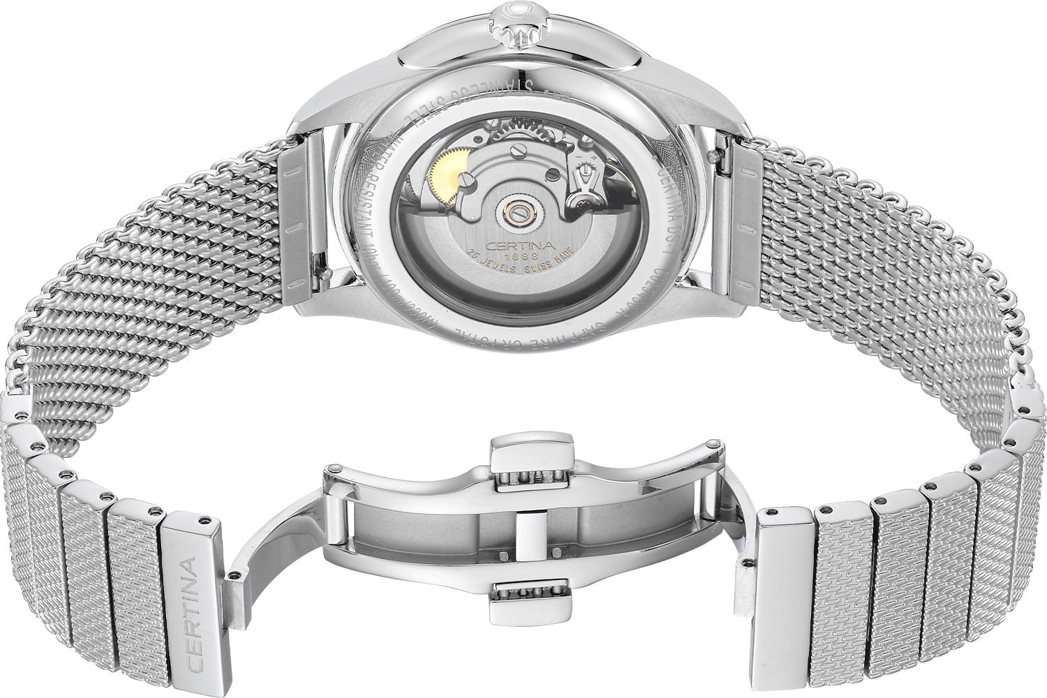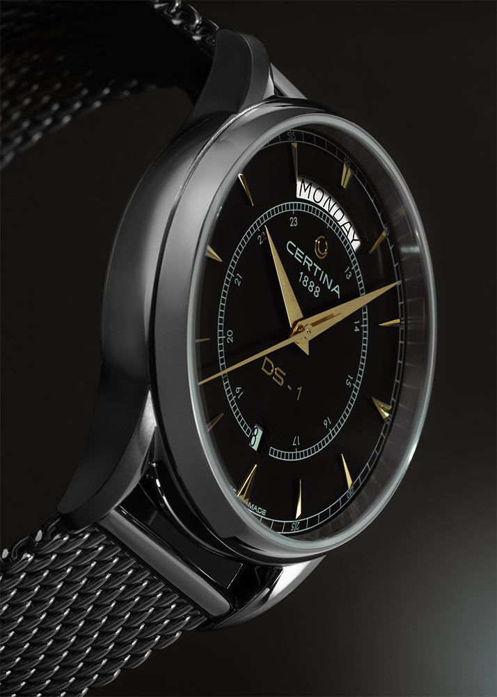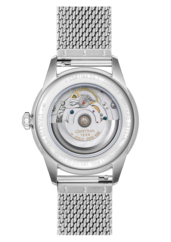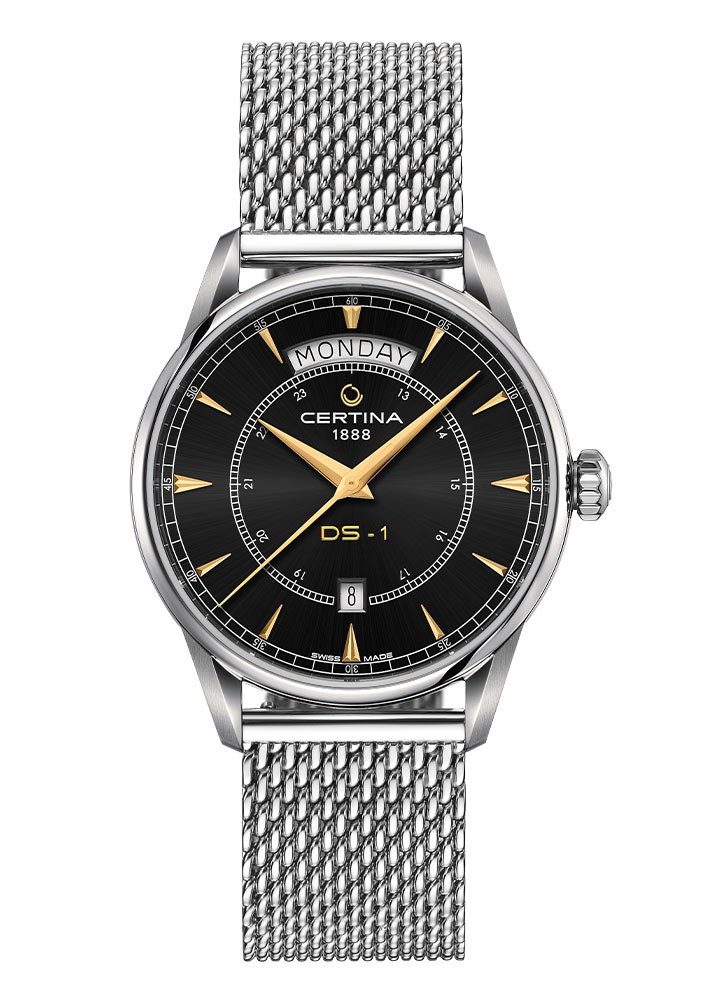 Elegantní, vypouklé safírové sklíčko na přední straně podtrhuje retro styl těchto hodinek a zároveň chrání černý ciferník. Ciferník okamžitě upoutá pozornost rozsáhlým zobrazením data. Ve 12 hodin se v klenutém okně zobrazuje celý název dne v týdnu a v 6 hodin se v okně zobrazuje den v měsíci. Tato jemná funkce zdůrazňuje pozornost věnovanou času a organizaci každodenního života, díky čemuž jsou hodinky Certina DS-1 Day Date mimořádně praktickým prvkem kolekce hodinek. Čas ukazují pozlacené dauphine ručičky spárované s elegantními indexy a arabskými číslicemi. Automatické pánské hodinky Certina na síťovaném náramku jsou mimořádně vytříbeným modelem, který jistě podtrhne individuální styl každého nadšence do hodinářství.