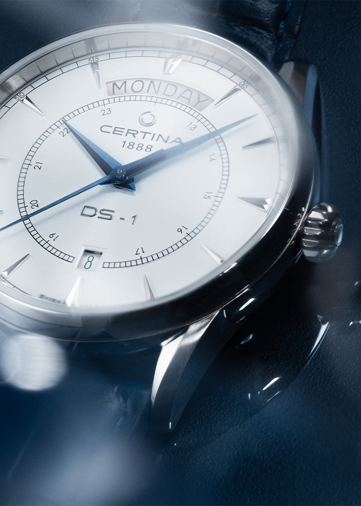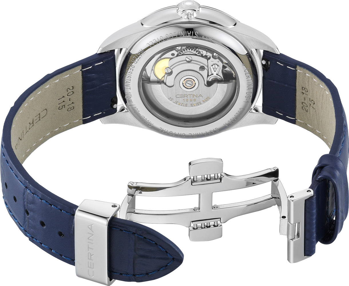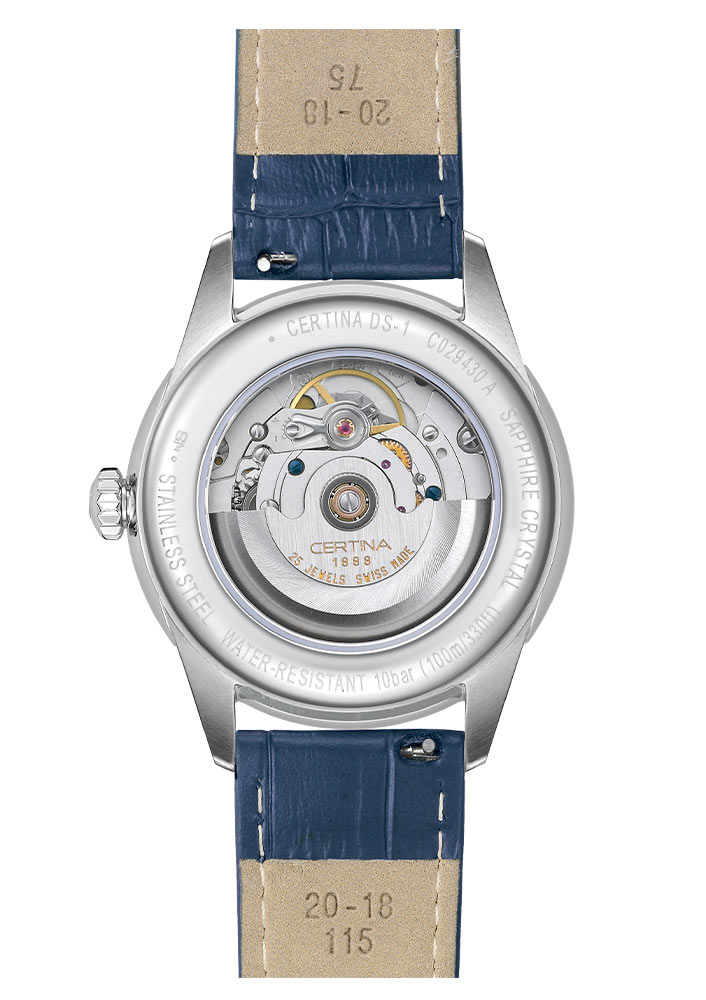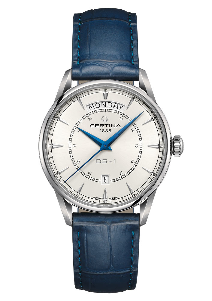 Elegantní, vypouklé safírové sklíčko na přední straně podtrhuje retro styl těchto hodinek a zároveň chrání bílý ciferník. Ciferník okamžitě upoutá pozornost rozsáhlým zobrazením data. Ve 12 hodin se v klenutém okně zobrazuje celý název dne v týdnu a v 6 hodin se v okně zobrazuje den v měsíci. Tato jemná funkce zdůrazňuje pozornost věnovanou času a organizaci každodenního života, díky čemuž jsou Certina DS-1 Day Date mimořádně praktickým prvkem kolekce hodinek. Čas ukazují modré ručičky Dauphine spárované s elegantními indexy a arabskými číslicemi. Automatické pánské hodinky Certina na koženém řemínku jsou mimořádně vytříbeným modelem, který jistě podtrhne individuální styl každého nadšence do hodinářství.