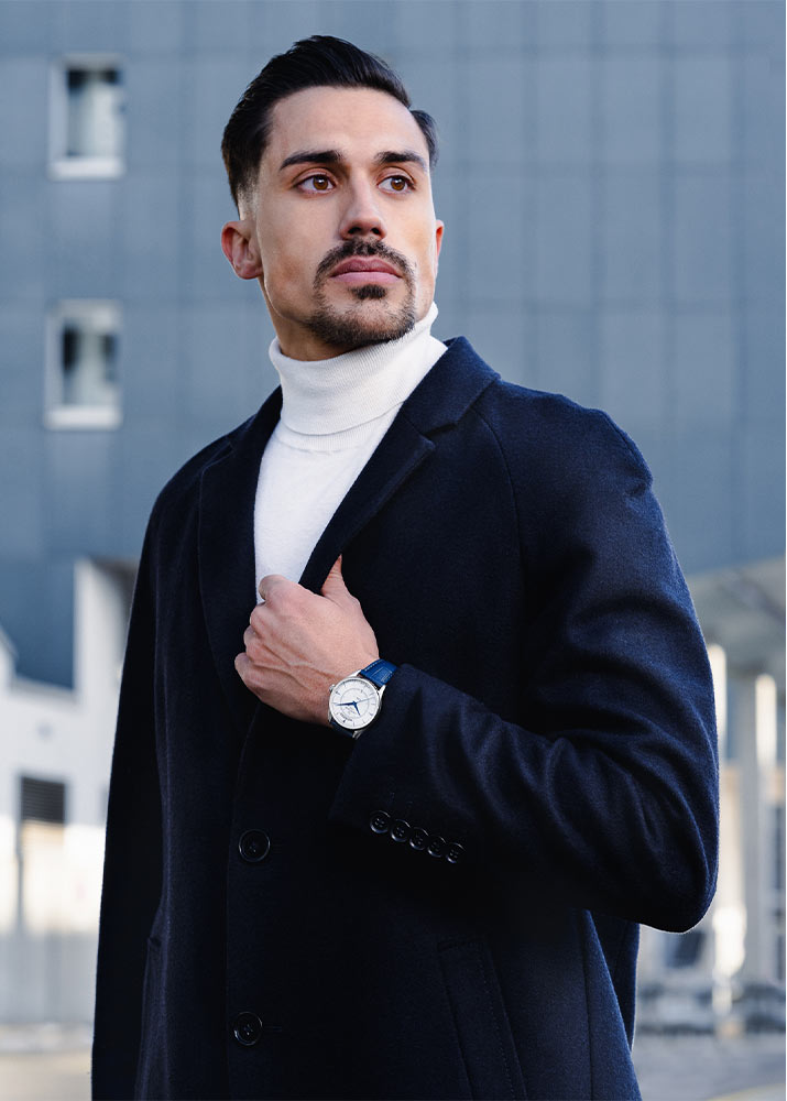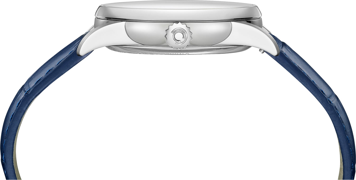 Kulaté pouzdro o průměru 40 mm je zavěšeno na jemném a na dotek příjemném řemínku, který hodinkám dodává jedinečný charakter. Modrý kožený náramek dodává nejen eleganci, ale také zajišťuje pohodlí v každé situaci, a to díky bezpečné a pohodlné motýlkové sponě. Zadní strana pouzdra je opatřena krytem, který umožňuje obdivovat precizní mechaniku hodin. Tento model je vybaven přesným, automatickým strojkem ETA 2834 Swiss Made s rezervou chodu až 40 hodin. Strojek poháněný pohybem zápěstí je v hodinářském světě známý systém, který svého majitele nezklame.