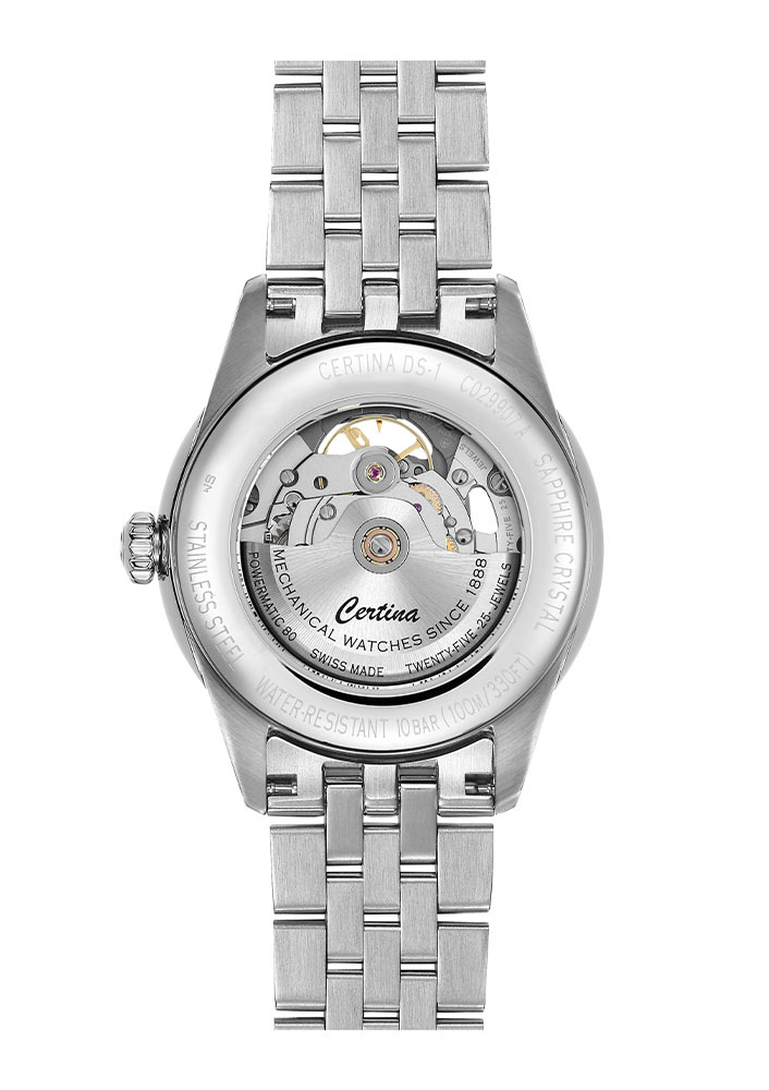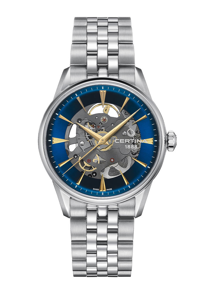 Nejkvalitnější safírové sklo s antireflexem kryje úchvatný skelet ciferníku. V debutovém modelu Certina DS-1 Skeleton si majitel může zblízka prohlédnout matnou strukturu, která drží ozubená kola, kameny a balanční pružinu na místě. Nadměrně velké pozlacené indexy jsou umístěny na širokém modrém prstenci obklopujícím kruhové okénko a označují hodiny s vysoce kontrastními akcenty, aby byla zajištěna vynikající čitelnost. Značka Certina dbá na lehkost a čistotu designu a představuje DS-1 Skeleton jako klasické hodinky se třemi pozlacenými ručičkami z nerezové oceli. Hodinky s odhaleným skeletovým mechanismem Certina jsou vybaveny automatikou Powermatic 80 s vysokou rezervou chodu až 80 hodin a balanční pružinou Nivachron™. Jeho antimagnetické vlastnosti a odolnost zajišťují přesnost a dlouhou životnost tohoto krásného a zajímavého strojku. Swiss Powermatic 80 je zajímavou ukázkou vynikající švýcarské hodinářství.